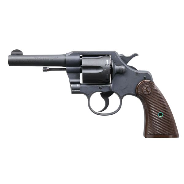 REVOLVER. Cal. 38 Spl. S# 17868. Bbl. 4". Commando double-action revolver mfg. by Colt circa. 1942-1943. Left side of the bbl. is marked "COLT COMMANDO/ .38 SPECIAL", with Colt's mfg. and patent information marked across the top. Left side of the frame is marked with a U.S. flaming ordnance bomb proof. Metal components exhibit a parkerized finish overall. Frame is mounted with 2-piece Colt checkered brown plastic grips. Half-moon blade front sight with square frame notched rear sight. CONDITION: Very good, with metal components retaining bountiful amounts of their original factory parkerized finish, exhibiting a few spots of light wear, as well as some scattered superficial marks from handling and storage. Mirror bore, exhibiting some scattered spots of light surface-level pitting while retaining well-defined rifling throughout. Grips are very good overall, showing some scattered superficial marks from handling and storage. (24-6841/MLW). CURIO. $500-800.