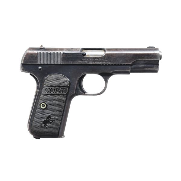 Cal. 380 ACP. S# 35396. Bbl. 3 3/4". Model 1908 Hammerless semi-automatic pistol mfg. by Colt in 1920. Left side of the slide is marked with Colt's patent and mfg. information, followed by the Rampant Colt logo, with the cal. designation marked on the right. Metal components exhibit a blue finish overall, save for on the chamber and muzzle, which are polished in-the-white. Frame is mounted with 2-piece Colt checkered black hard rubber grips. Half-moon blade front sight with U-notch rear sight. Interior of the slide is matching to the frame via the last three digits of the S#. MAGS: One 2-tone 7-rd. CONDITION: Metal components retain good amounts of their original factory blue finish, exhibiting areas of wear and thinning that show through to gray patina, as well as areas of light to mild surface oxidation and pitting overall. Poor bore, exhibiting moderate dark pitting and oxidation, while retaining strong rifling throughout. Grips show some smoothing, as well as some superficial marks from handling and storage, but otherwise remain sturdy and serviceable. (24-7214/MLW). CURIO. $300-400.