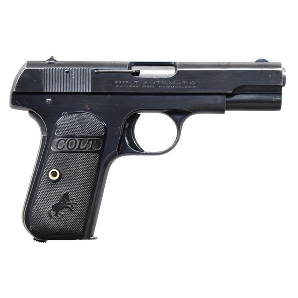 Cal. 380 ACP. S# 75552. Bbl. 3 3/4". Model 1908 Hammerless semi-automatic pistol mfg. by Colt in 1925. Left side of the slide is marked with Colt's mfg. and patent information, followed by the Rampant Colt logo, with the cal. designation marked on the right. Metal components exhibit a blue finish overall, save for on the chamber and muzzle, which are polished in-the-white. Frame is mounted with 2-piece Colt checkered black hard rubber grips. Interior of the slide is matching to the frame via the full S#. MAGS: One 2-tone 7-rd. CONDITION: Good, with metal components retaining large amounts of their original factory blue finish, exhibiting some areas of wear and thinning, some scattered superficial handling marks, as well as areas with varying degrees of surface oxidation overall. Fair bore, exhibiting moderate pitting, while retaining strong rifling throughout. Grips show some smoothing, as well as some superficial marks from handling and storage, but otherwise remain sturdy and serviceable. (24-7215/MLW). CURIO. $300-500.
