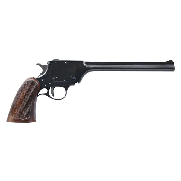PISTOL. Cal. 22 LR. S# 1997. Appears to be 4th Variation w/ 10" barrel. Hooked Patridge blade front sight & square notch rear sight. Long hammer spur. Lever type ejector. "T" barrel latch with round checkered ends. Straight grooved trigger. One piece checkered walnut grip. CONDITION: very good blue mixed with scattered areas of worn finish & pinprick patina. Very good Grip with small marks. Shiny bore with strong rifling. (24-6974/MD). CURIO. $600-1000.