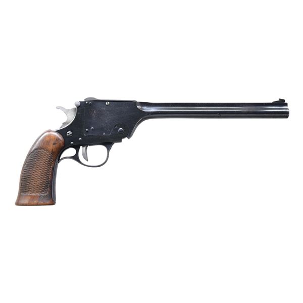 PISTOL. Cal. 22 LR. S# 1745. Appears to be 4th Variation w/ 10" barrel. Hooked Patridge blade front sight & square notch rear sight. Long hammer spur. Lever type ejector. "T" barrel latch with round checkered ends. Straight grooved trigger. One piece checkered walnut grip. CONDITION: good blue mixed with freckling patina throughout; front strap shows carry wear. Good Grip with small gouges. Shiny bore with strong rifling. (24-6976/MD). CURIO. $500-800.