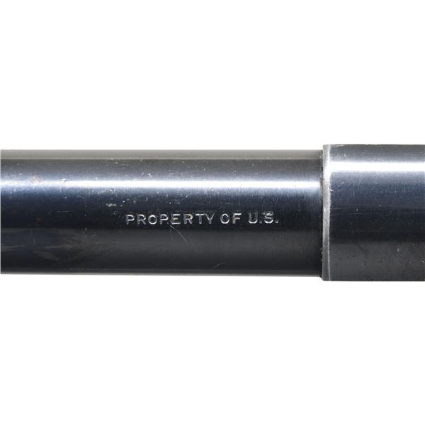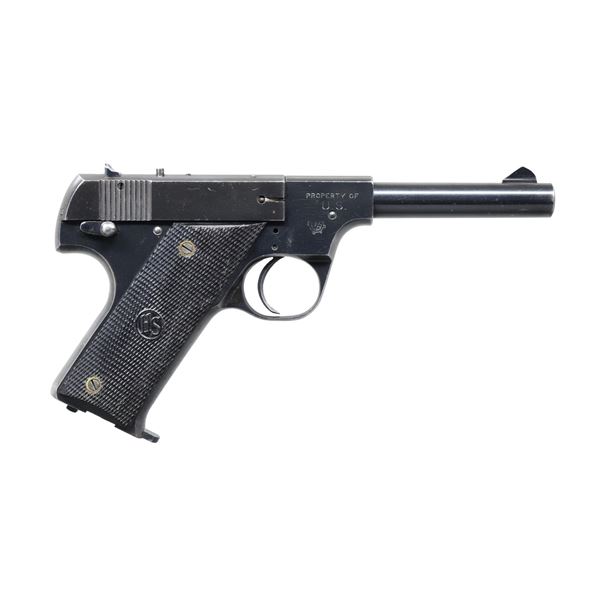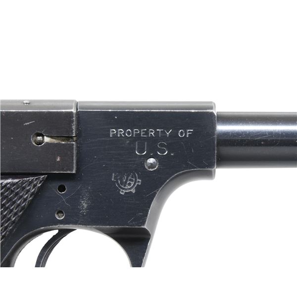 PISTOL. Cal. 22 LR. S# 107798. Bbl. 4 1/2" light weight with PROPERTY OF U.S." on top; slanted serrated faced front sight and windage adjustable notched rear on matching numbered slide. Approx. 14,000 made 1942-1943 for military training during WW-II. Later example with Type II takedown and redesigned backstrap contour utilized by S# 101000. Checkered hard rubber grips with "HS" logos. Left side serrated thumb safety lever, right side takedown lever used in conjunction with button on top of slide plus curved thin trigger and bottom rear magazine latch. Ordnance wheel on right front side of frame along with "PROPERTY OF / U.S.". MAGS: 1 blued 2 tone 10 rd. with aftermarket appearance. CONDITION: very good appearance with thinning in grip area and at high points plus light scratches throughout. Very slight wear and marks on grips but no structural damage. Near excellent bore. (24-7228/NW). CURIO. $450-600.
