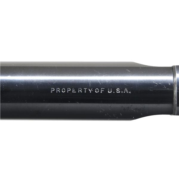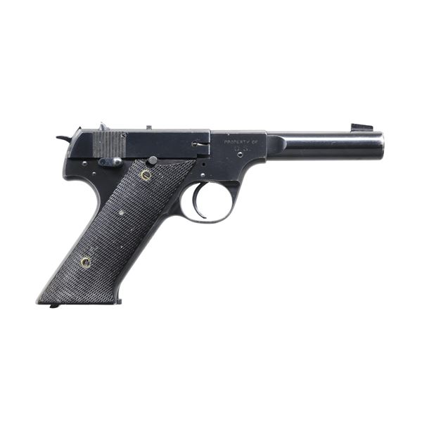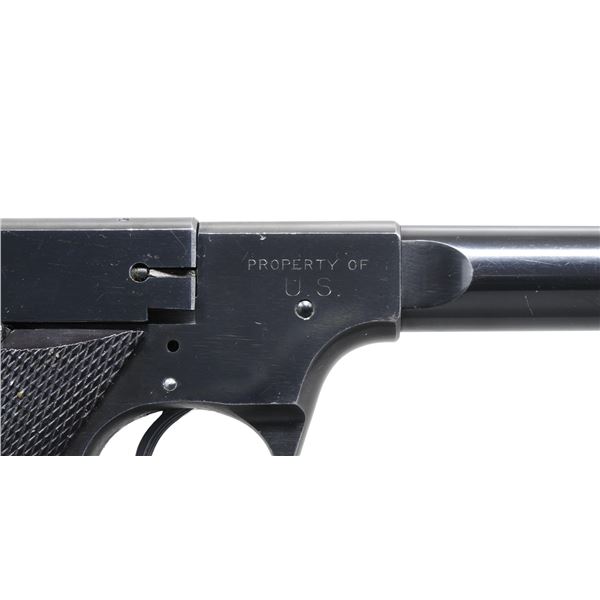 Cal. 22 LR. S# 125612. Bbl. 4 1/2" medium weight with PROPERTY OF U.S.A." on top; serrated faced Patridge front sight and windage adjustable notched rear on slide. Approx. 34,000 made 1943-1945 for military training during WW-II. Earlier example with blued finish (premium value); parkerizing began about S# 128000. Checkered hard rubber grips, left side thumb safety lever, exposed hammer, matching numbered slide, right side takedown lever used in conjunction with button on top of slide, checkered last round slide lock, serrated and curved thin trigger plus bottom rear magazine latch. Right front side of frame marked "PROPERTY OF / U.S.". MAGS: 1 blued 10 rd. factory with additional latch point near top (intended for later model). CONDITION: good to very good overall with thinning in grip area and at high points plus some very light scratches throughout. Slight wear and marks on grips (most notable on right) but no structural damage. Retracting spring is kinked and should be replaced for smooth operation along with the retracting rod to facilitate proper takedowns. Near excellent bore. (24-7224/NW). CURIO. $450-600.