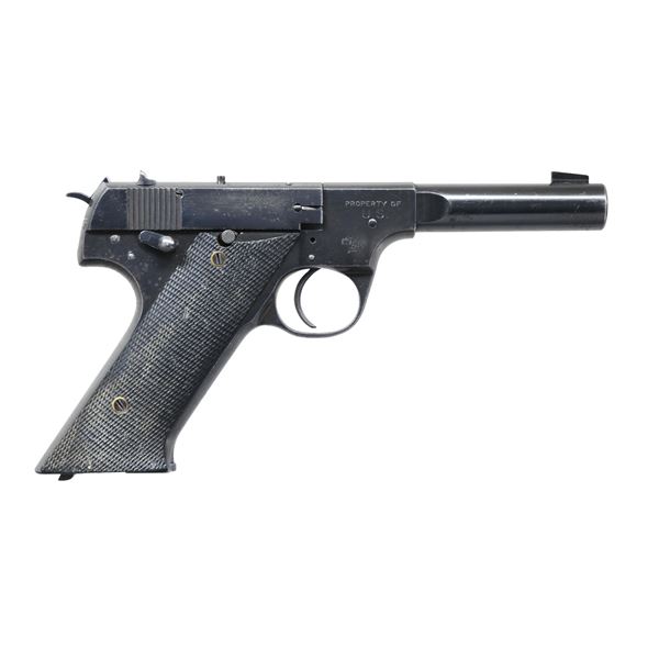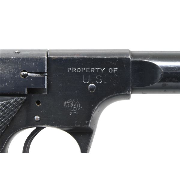 Cal. 22 LR. S# 120105. Bbl. 4 1/2" medium weight with PROPERTY OF U.S.A." on top; serrated faced Patridge front sight and windage adjustable notched rear on slide. Approx. 34,000 made 1943-1945 for military training during WW-II. Earlier example with blued finish (premium value); parkerizing began about S# 128000. Checkered hard rubber grips, left side thumb safety lever, exposed hammer, matching numbered slide, right side takedown lever used in conjunction with button on top of slide, checkered last round slide lock, serrated and curved thin trigger plus bottom rear magazine latch. Ordnance wheel on right front side of frame along with "PROPERTY OF / U.S.". MAGS: 1 blued 2 tone 10 rd. with aftermarket appearance. CONDITION: good appearance with numerous areas of cleaned peppery to light oxidation. Thinning in grip area and at high points plus light scratches throughout. Slight wear and marks on grips but no structural damage. Near excellent bore. (24-7231/NW). CURIO. $450-600.