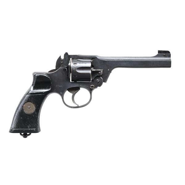 REVOLVER. Cal. 38 S&W. S# 8018; the serial number matches on frame, bbl., and cyl. Frame is marked on the right side with "DI" and two stars—this being the wartime Enfield marking, and additionally marked "ENGLAND" as a 1950s vintage US import mark. Bbl. 5", marked on top with "CAL. 38" (broad arrow) 44" with a view mark. Bbl. is marked on the left side with "(crown) BNP" proof ".38 767 3 1/2 TONS". The six-shot cyl. has proof marks and "SPT. 41." The revolver is made as double-action only, without a hammer spur, by request of the Royal Tank Regiment. Fixed sights. Black composite grips with correct thumb grooves. Lanyard ring on the butt. CONDITION: Metal retains 80% of its original wartime matte blue finish, with light wear and handling marks. Grips have moderate wear, scratches, and handling marks. Bore is shiny with lightly worn lands. (24-6766/RW). CURIO. $300-400.