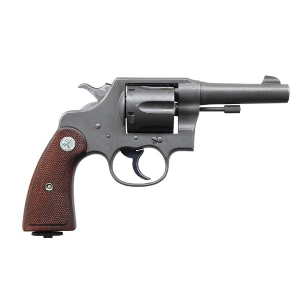 WITH HOLSTER. Cal. 38 Spl. S# 345863. Bbl. 4". New Service double-action revolver mfg. by Colt in 1938 and subsequently used by the British during WWII. Left side of the bbl. is marked "NEW SERVICE 38 SPECIAL", with Colt's mfg. and patent information marked across the top. Left side of the frame is marked with the Rampant Colt logo, "VP" proof, and a British military proof, with "/380" stamped on the left side of the frame at the chamber. Metal components exhibit a reapplied parkerized finish overall, with the trigger and lanyard loop exhibiting a blue finish. Frame is mounted with 2-piece Colt silver medallion checkered wood grips. Clipped point blade front sight with square frame notched rear sight. UNATTACHED ACCESSORIES: Khaki British web canvas holster. CONDITION: Metal components retain the majority of their reapplied parkerized finish, exhibiting some light to mild wear, scattered superficial handling marks, and a few spots of moderate surface oxidation. Brilliant mirror bore, exhibiting well-defined rifling throughout. Grips are good, showing some light to mild smoothing and some scattered handling marks overall. Holster shows some age-related discoloration, but otherwise remains sturdy and serviceable. (24-6846/MLW). CURIO. $400-600.
