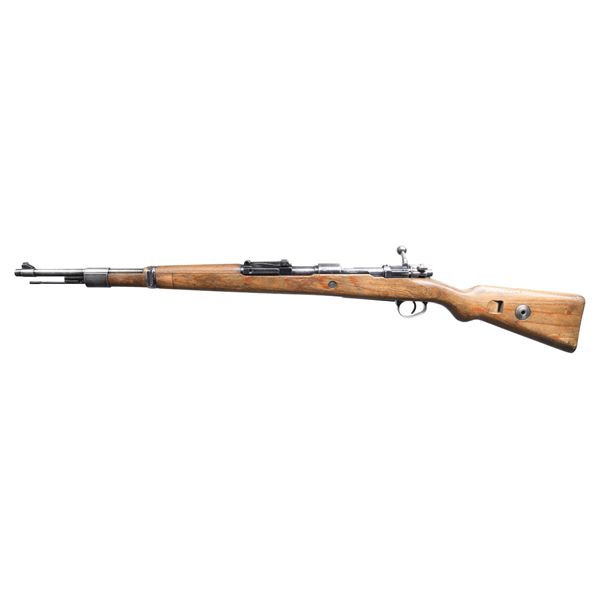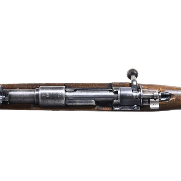 RIFLE. Cal. 8x57 (8mm Mauser). S# 57i). Bbl. 23 1/2". Blade front sight without hood. Tangent rear sight graduated to 2000m. Left side of rear sight base has ZF-41 scope base. matching numbers on receiver, bolt release, trigger guard, both bands & floorplate. Bolt parts & handguard are mismatched. Other parts appear unnumbered. Receiver top marked "ar 42" denoting 1942 mfr. by Mauser Borsigwalde. Blued finish. Laminated stock set with left side sling provisions. Band Keeper is missing. Replacement cleaning rod present. UNATTACHED ACCESSORIES: fnj44 coded S84/98 bayonet with mismatched cof 43 coded scabbard in very good condition. CONDITION: stock has visible duffel cut repair behind rear band, notable cracks on both sides of wrist, a small handguard crack, a few gouges, scattered dings, flaking & handling marks. Trigger guard is warped & bent. Metal is mostly a gray patina with scattered dings, oxidation staining & traces of original blue. Action functions properly when hand cycled. Bore is mostly bright with a few spots of light pitting but strong rifling. (25-479/MJC). CURIO. $500-800.
