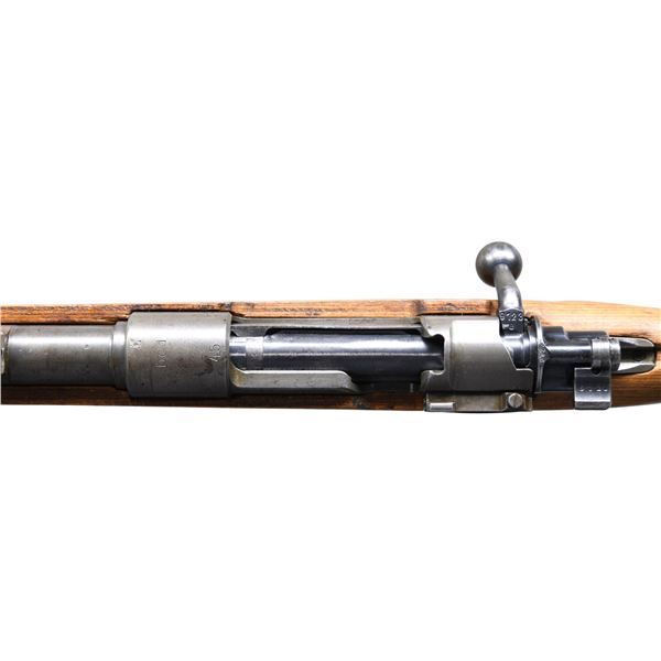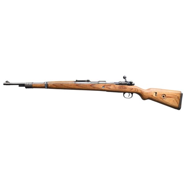 Cal. 8x57 (8mm Mauser). S# 86274. Bbl. 23 1/2". Blade front sight without hood. Tangent rear sight graduated to 2000m. Mismatched blued bolt parts & other parts appear unnumbered as-is typical for late war K98ks. Receiver top has German eagle "749" inspection stamp & "bcd 45" markings denoting mfr. by Gustloff Werke in 1945. Floorplate & trigger guard are both marked "qnw". Blued trigger guard. Other parts have phosphate finish. Replacement laminated stock set with left side sling provisions & eagle "H" (Heer) marking on right side of butt. Stock is cut for a takedown disc that is not present. CONDITION: stock set shows some dings & handling marks. Floorplate appears cleaned to bright. Metal shows scattered fading, dings & oxidation. Action functions properly when hand cycled. Bore is mostly bright with some scattered oxidation & light pitting but strong rifling. (25-480/MJC). CURIO. $500-800.