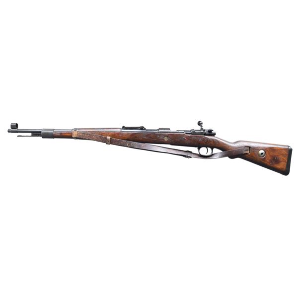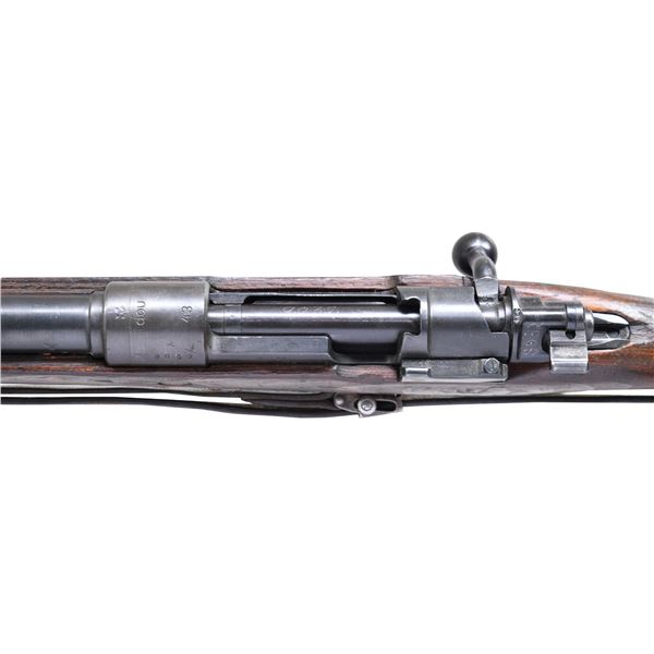 BRUNN K98K BOLT ACTION RIFLE WITH BAYONET. Cal. 8x57mm. S# 9032e. Bbl. 24". K98k bolt action rifle mfg. in Czechoslovakia by Waffenwerke Brunn while under German occupation in 1943. The top of the receiver is marked with a Brunn WaA80 proof above Brunn's "dou" mfg. code and the 2-digit year of mfg. "43", 2 Russian capture "X" marks, an eagle firing proof, and the S# marked on the left, and with "Mod. 98" marked on the left receiver wall. Right side of the bbl. is F Guns import marked. Metal components exhibit a Russian reapplied blue finish overall. Laminated wood buttstock and handguard, have been sanded and re-lacquered. Hooded blade front sight, with standard tangent rear sight. Matching numbers are present on the receiver and stock. Bolt body, bolt shroud, cocking piece, trigger guard, and floorplate are matching via "9032" in electro-pencil, with the stock having been renumbered on the left side of the butt. Complete with a period brown leather sling marked "D&C" on the buckle. UNATTACHED ACCESSORIES: blued bayonet marked "42 cof" (Carl Eickhorn) on the left side of the ricasso, with "1866/ b" marked on the right. Bayonet is fitted with 2-piece brown grooved bakelite grips, and is complete with a scabbard and reproduction black leather frog. CONDITION: very good, with metal components retaining the majority of their Russian arsenal reapplied blue finish, exhibiting some areas of light wear and thinning, with some areas of pitting present beneath the bluing. Dark pitted bore, retaining good to strong rifling throughout. Wood furniture shows scattered marks and impressions from handling and storage, but otherwise remains sturdy and serviceable. Sling remains malleable, exhibiting age related cracking and crazing overall. Bayonet retains much of its original blue finish, exhibiting areas of wear and striations from prior cleaning. (25-999/MLW). CURIO. $600-900.