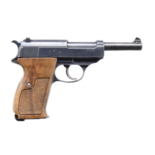 SEMI-AUTOMATIC PISTOL. Cal. 9mm. S# 8296k. Bbl. 4 7/8". P.38 semi-automatic pistol mfg. by Walther for the German military in 1943. Left side of the slide is marked "P.38", followed by Walther's mfg. code and the 2-digit year of mfg. "ac/ 43" and the S#, with Walther Eagle/359 proofs marked on the right. Metal components exhibit a salt blue finish overall. Frame is mounted with 2-piece aftermarket checkered wood grips. All serialized parts are matching and include the frame, slide, bbl., and locking block. MAGS: 8-rd. CONDITION: good, with metal components retaining large amounts of their original arsenal blue finish, exhibiting areas of wear and thinning that show through to gray patina, as well as scattered areas of light to mild pitting and surface oxidation. Dark pitted bore, retaining strong rifling throughout. Grips are good, showing some smoothing to the checkering and some scattered superficial marks from handling and storage, with the left panel exhibiting a large chip at the top right corner. (25-580/MLW). CURIO. $1,000-1,500.