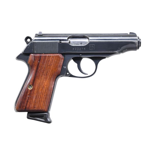 SEMI-AUTOMATIC PISTOL. Cal. 7.65mm. S# 393276. Bbl. 3 7/8". Model PP semi-automatic pistol mfg. by Walther for the West German police in 1969. The left side of the slide is marked with the Walther banner logo, followed by markings stipulating Walther's mfg. information, as well as the model and cal. designations. Left side of the frame and right side of the slide exhibit a boxed "Nds" proof, indicating issue to the German Niedersachsen Police. Right side of the frame is marked "69", followed by an Ulm Proof House antler, as well as with an Eagle/N commercial nitro proof. Metal components exhibit a lustrous high polish blue finish overall, save for on the chamber, which is polished in-the-white. Frame is mounted with 2-piece aftermarket plain wood grips. Slide features a matte rib, with a fixed blade front sight, and dovetailed square notch rear sight. MAGS: 1 aftermarket 8-rd., with black synthetic grip extension. UNATTACHED ACCESSORIES: generic black soft case. CONDITION: metal components retain the majority of their original factory blue finish, exhibiting some areas of light to mild wear and thinning, as well as some small scattered splotches of losses to the finish. Mirror bore, retaining well defined rifling throughout. Grips are very good overall. (25-1013/MLW). CURIO. $300-500.