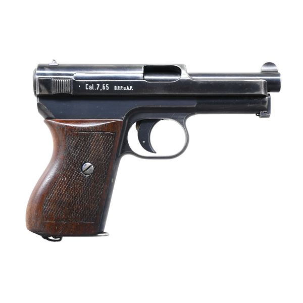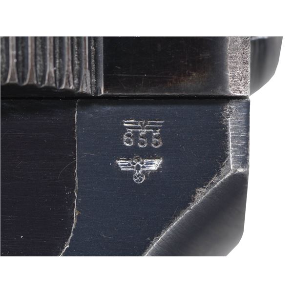 SEMI-AUTOMATIC PISTOL. Cal. 7.65mm. S# 592887. Bbl. 3 3/8". One of only approx. 8,000 Model 1934 semi-automatic pistols mfg. by Mauser that were procured for the German military from 1940-1941. Left side of the slide is marked with the S# within a milled panel, followed by Mauser's mfg. information, with "Cal. 7,65 D.R.P.u.A.P." marked on the right. Left side of the frame is marked with an Eagle/655 acceptance proof, above an eagle-firing proof. Sideplate is marked with the Mauser banner logo. Metal components exhibit a polished salt blue finish overall. Frame is mounted with a 1-piece checkered wood wraparound grip. Half-moon blade front sight with U-notch rear sight. All serialized parts are matching and include the frame, sideplate, slide, and bbl. MAGS: two 8-rd. CONDITION: very good, with metal components retaining the majority of their original blue finish, exhibiting some areas of light to mild wear and thinning, some scattered superficial handling marks, as well as some scattered spots of light surface-level oxidation and pitting. Mirror bore, exhibiting a few small spots of mild pitting towards the muzzle, while retaining well-defined rifling throughout. Grip shows some scattered marks and minor impressions from handling and storage, but otherwise remains sturdy and serviceable. (24-6764/MLW). CURIO. $500-1,000.