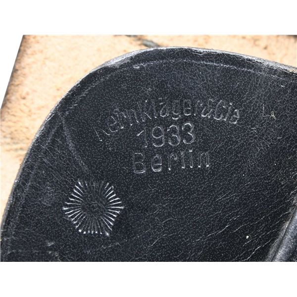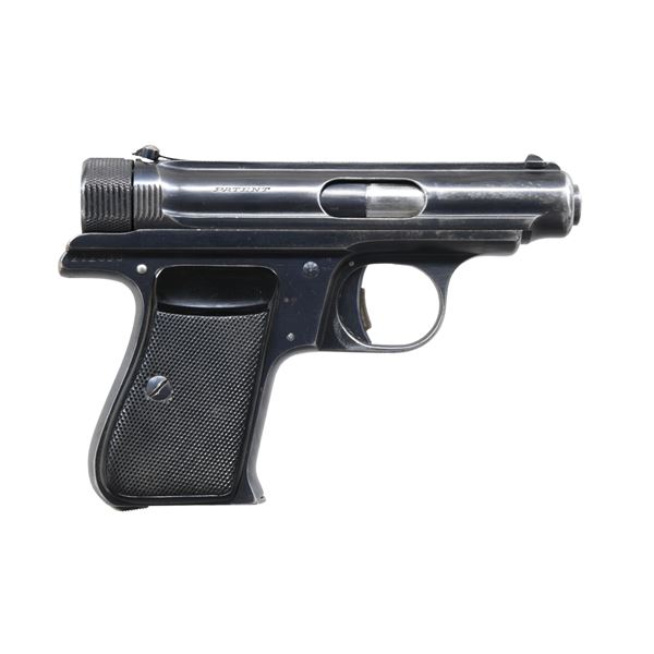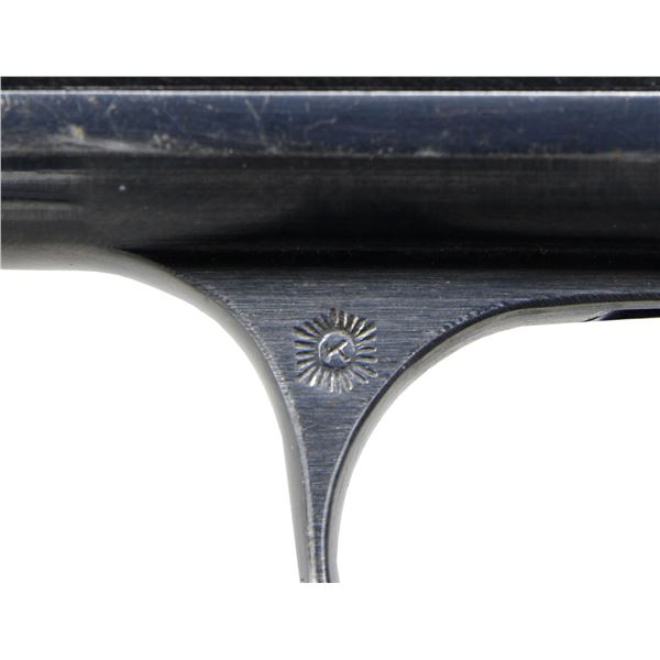 BEHORDENMODELL SEMI-AUTOMATIC PISTOL WITH HOLSTER. Cal. 7.65mm. S# 212398. Bbl. 3". 1930 Behordenmodell semi-automatic pistol mfg. by J.P. Sauer & Sohn. The left side of the slide is marked "J.P. SAUER & SOHN, SUHL", followed by the J.P. Sauer logo and cal. designation, with "PATENT" marked on the right. Left side of the frame is marked with a German "K" within a sunburst proof, denoting police issue. Metal components exhibit a blue finish overall, save for on the trigger safety, which is strawed. Frame is mounted with 2-piece checkered black hard rubber grips, which exhibit the cal. designation and "SUS" monogram on the left panel. Blade front sight with U-notch rear sight. All serialized parts are matching and include the frame, trigger bar, slide, and slide end cap. MAGS: One 7-rd. UNATTACHED ACCESSORIES: Black leather holster marked "KernKlager&Cie/ 1933/ Berlin" above a German police starburst proof. CONDITION: Metal components retain the majority of their original factory blue finish, exhibiting some areas of wear and thinning that show through to gray patina, some superficial handling marks, as well as a few spots of light surface oxidation and pitting. Mirror bore, exhibiting well-defined rifling throughout. Grips are very good, showing some smoothing and some scattered superficial handling marks overall. Left grip panel exhibits some cracking on the interior. Holster is excellent, remaining malleable and showing some mild wear from use. (24-6845/MLW). CURIO. $500-1,000.