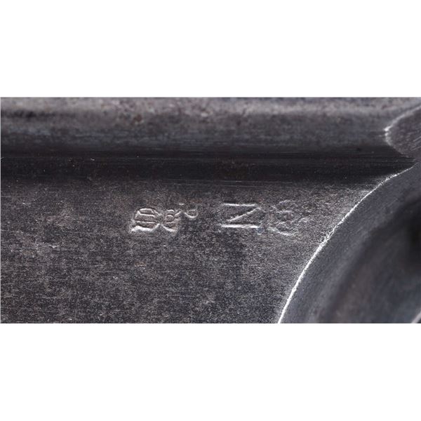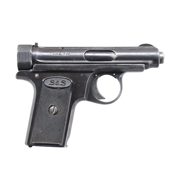 SEMI-AUTOMATIC PISTOL WITH HOLSTER. Cal. 7.65mm. S# 79393. Bbl. 3". A 2nd Variation Model 1913 semi-automatic pistol mfg. by J.P. Sauer & Sohn for the Imperial German military in WWI. Top of the slide is marked "J.P. SAUER & SOHN, SUHL," followed by the J.P. Sauer logo, with "PATENT." marked on the left and the cal. designation marked on the right. Left side of the frame is marked with the S#, with a diminutive Imperial German military acceptance proof, followed by a Crown/N commercial nitro proof marked on the right. Metal components exhibit a blue finish overall, save for on the bbl. and firing pin, which are polished in-the-white. Frame is mounted with 2-piece "S&S" checkered brown hard rubber grips. Half-moon blade front sight with U-notch rear sight. All serialized parts are matching via what appears to be an assembly # (3036) and include the frame, slide, bolt, firing pin, and slide end cap. MAGS: one 7-rd. UNATTACHED ACCESSORIES: brown pebble grain leather holster marked "GENOSSENSCH./ SATTLEREI/ BRESLAU/ 1915." on the body, beneath the closure flap. CONDITION: metal components retain large amounts of their original factory blue finish, exhibiting areas of wear and thinning that show through to gray patina, with scattered spots of light to mild surface oxidation and some pitting present overall. Fair bore, exhibiting moderate pitting and a small bulge, while retaining fair to good rifling throughout. Holster remains malleable, exhibiting wear and some light age-related cracking. (24-6840/MLW). CURIO. $300-400.
