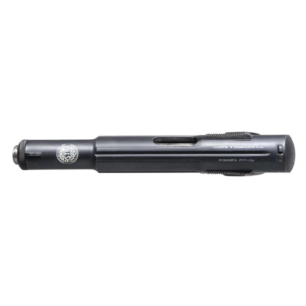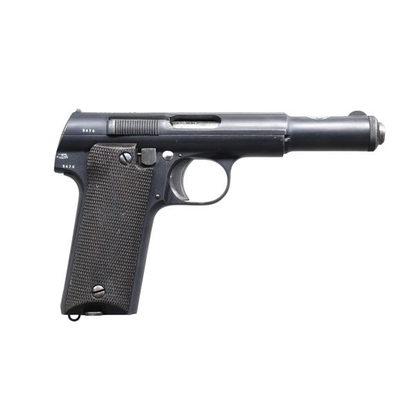 AUTOMATIC PISTOL WITH HOLSTER. Cal. 9mm Luger. S# 9476. Bbl. 5 1/4". Model 600/43 semi-automatic pistol mfg. in Spain by Astra under contract for Germany during WWII. The top of the slide is marked with the Astra logo towards the muzzle, with Astra's mfg. information marked at the rear. Left side of the frame is marked with Spanish proofs, with a German Eagle/WaAD20 proof and the S# marked on the right. Left side of the frame is stamped "UNCETA Y COMPANIA/ 9476" beneath the grip panel. Frame and slide exhibit what appears to be a professionally reapplied blue finish, with the bbl., trigger, and safety lever being polished in-the-white. Frame is mounted with 2-piece checkered wood grips. Half-moon blade front sight with U-notch rear sight. All serialized parts are matching and include the frame, slide, and bbl. Mag. floorplate has been numbered to match, likely by an armorer during the period. MAGS: two 8-rd. UNATTACHED ACCESSORIES: black leather holster marked "bqr44" above an Eagle/WaA66 on the interior of the closure flap. CONDITION: very good, with metal components retaining the vast majority of their blue finish, exhibiting some spots of wear and thinning overall. In-the-white parts show scattered spots of age-related discoloration. Mirror bore, exhibiting well-defined rifling throughout. Grips are very good, showing some mild smoothing and some scattered marks from handling and storage. Holster remains malleable, exhibiting some age-related cracking and light crazing overall. (24-6802/MLW). CURIO. $400-600.