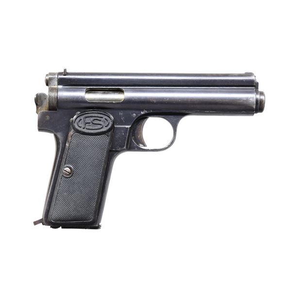 PISTOL. Cal. 7.65mm (32 ACP). S# 75947. Bbl. 4". Round blade front sight. V-notch fixed rear sight. About 37,000 Frommer stops were used by Imperial Germany during WW1. Left front of trigger guard has circled "BP" proof & German crown "P" marking. Blued finish. Black checkered hard rubber grips with "FS" logo. MAGS: 2-7 rd. UNATTACHED ACCESSORIES: aftermarket hardcase with keys. CONDITION: grips show checkering wear, scattered handling marks & a couple light chips. Metal retains 50% original blue with scattered edge wear, fading, some light pitting on grip safety, oxidation & dings. Action appears to function properly when hand cycled. Very good bore with some light oxidation. (24-6778/MJC). CURIO. $300-500.