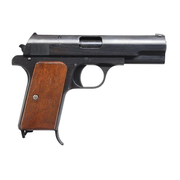 PISTOL. Cal. 7.65mm (32 ACP). S# 59162. Bbl. 4". Blade front sight. V-notch rear sight. Matching numbers on fame, bbl. & slide. Left side of slide marked "P. Mod 37, Kal 7,65" & "jhv 43". Left front of trigger guard marked with German eagle "WaA173" inspection stamp. Blued finish. Grooved hardwood grips. MAGS: 1-8 rd. matching numbered to gun. UNATTACHED ACCESSORIES: aftermarket black hardcase with tan Luftwaffe P.37 holster. CONDITION: grips show scattered handling marks. Metal retains 70% original blue with scattered light oxidation & fading to brown. Action functions properly when hand cycled. Bright near excellent bore. (24-6834/MJC). CURIO. $400-600.