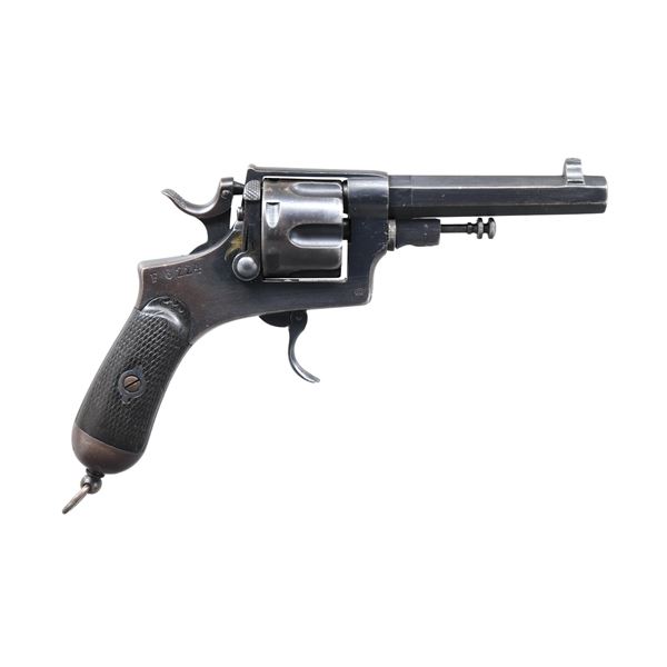 Cal. 10.25mm. S# F6224. Bbl. 4 1/3". Blade front sight. Fixed rear sight. 1912 dated Bodeo 1889 revolver made by Castelli of Brescia. Arsenal rework blue finish. Checkered hardwood grips. Lanyard ring present on bottom of grip frame. UNATTACHED ACCESSORIES: aftermarket hardcase with 1889 Bodeo canvas holster. CONDITION: grips show heavy checkering wear, some chipping, dings & handling marks. Metal retains 70% arsenal rework blue with some small pitting spots on grip straps, scattered small dings, edge wear & fading to gray. Action is a bit sluggish but functional when hand cycled. Bore shows scattered light pitting & frosting but strong rifling. (24-6806/MJC). CURIO. $350-550.