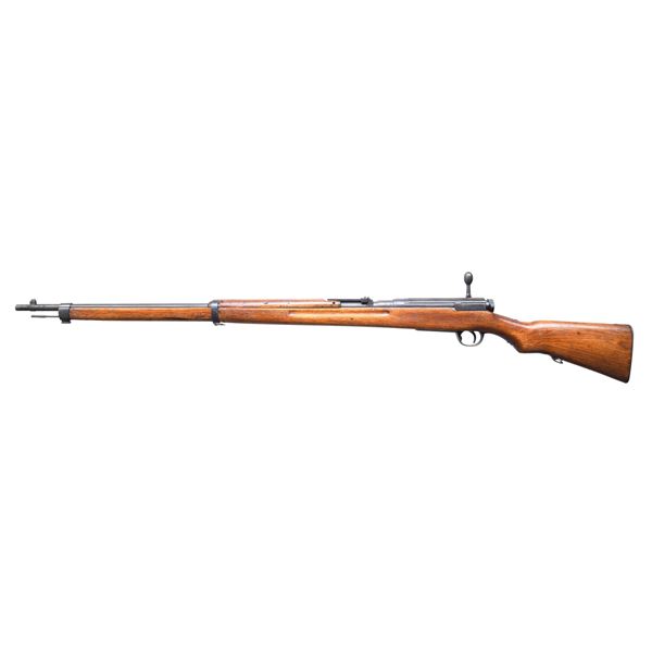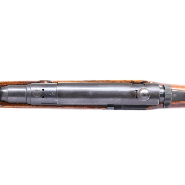 RIFLE. Cal. 6.5 Jap. S# 1141008. Numbers match on receiver and bolt assembly. Bbl.31 1/4". Receiver marked on the left rail with the Koishikawa arsenal interlocking circles. Mum has been defaced by grinding but is visible and the 38 Type characters are sharp and clear. Ladder rear sight graduated to 2400 meters. Inverted "V" front sight w/o protective ears. Bolt has oval knob and large tang checkered safety knob. non-matching dust cover. 29 1/2" cleaning rod does not latch in place. Bayonet lug is present. Hardwood stock set with two piece buttstock. CONDITION: stock set has moderate wear, scratches and handling marks with arsenal rework finish. Metal retains 75% of its original blue finish with thinning , wear and small spots of oxidation. Dark bore with worn lands. (25-979/RW). CURIO. $ 350-550.