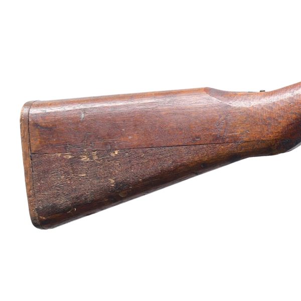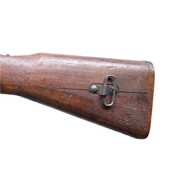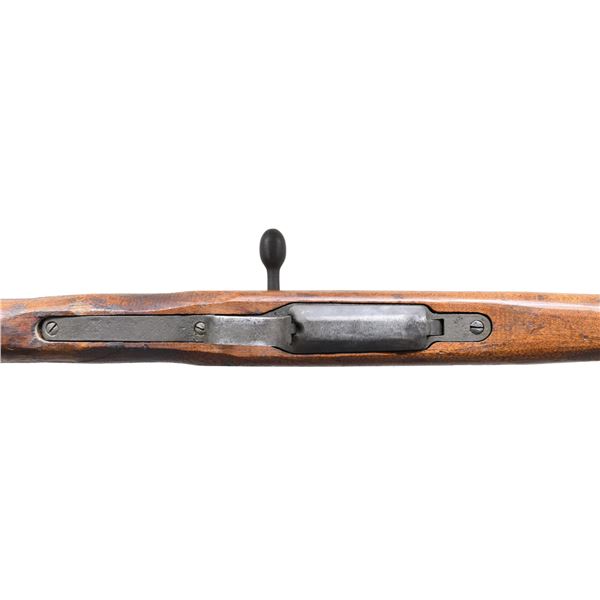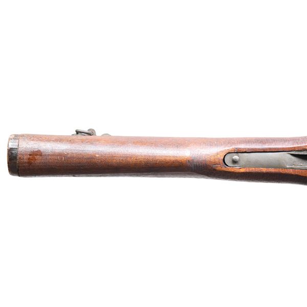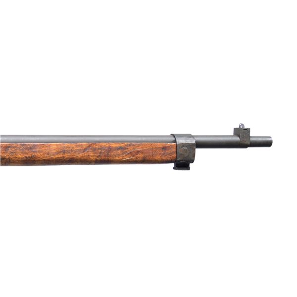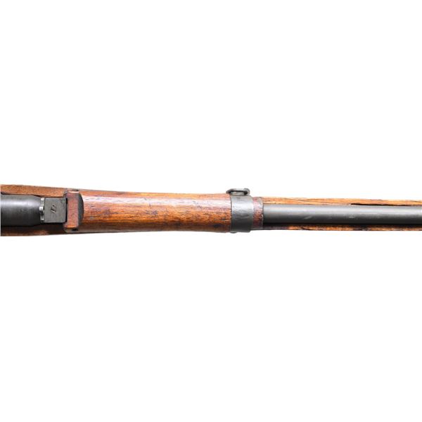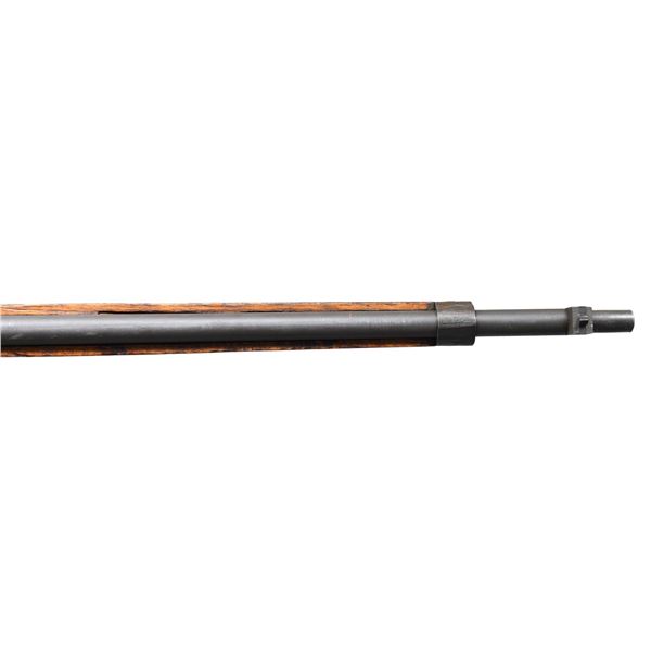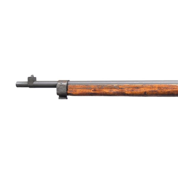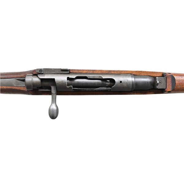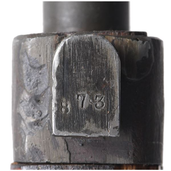 ACTION RIFLE. Cal. 30-06. S# 71873. Bbl. 25 1/2". Blade front sight without protective ears. Fixed aperture rear sight. All numbered parts are matching to receiver including firing pin. Type 99 Arisaka rifle converted to 30-06 for use by South Korean forces during the Korean War. Receiver top is notched for 30-06 & has ground mum. Left side of receiver has serial number, Kokura & "US CAL .30" markings. Arsenal rework parkerized finish. Asian hardwood stock set with two piece butt & left side sling swivels. Stock also has seperate forend & no provision for a cleaning rod hole. UNATTACHED ACCESSORIES: Jinsen made Type 30 bayonet without scabbard in very good condition. Bayonet has brightly finished blade & hooked crossguard. CONDITION: stock set shows some improper band removal wear, a small crack on handguard, some chipping, scattered flaking, dings & handling marks. Metal retains 70% arsenal rework parkerized finish with scattered edge wear, fading & light oxidation. Action functions properly when hand cycled. Very good bright bore. (25-485/MJC). CURIO. $300-400.