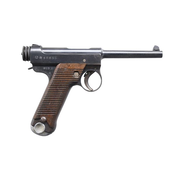 Cal. 8mm Nambu. S# 42835. Bbl. 4 3/4". Blade front sight. Fixed rear sight. Matching numbers on slide, bolt, cocking piece & trigger. Firing pin & extension are unnumbered. Rear right of frame has "13.1" Showa date for January, 1938. Right rear of slide has Nagoya & Kokubunkji markings with serial number. Blued finish with strawed small parts. Grooved Asian hardwood grips with faint pencil numbers that are faint. MAGS: 2-8 rd. one matching & one mismatched. UNATTACHED ACCESSORIES: leather clamshell holster with spare firing pin. CONDITION: grips show a scratch from safety rotation, some dings & handling marks. Metal retains most of its original blue but shows oxidation throughout & some edge wear. Safety has a bit of play but is functional. Action is otherwise functional when hand cycled. Very good bright bore. (24-7000/MJC). CURIO. $600-900.