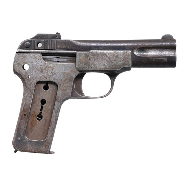 Cal. 32. S# 25083. Bbl. 3 7/8". Copy of an FN Model 1900 semi-automatic pistol mfg. in China. Left side of the slide is marked with faux Chinese FN markings, with the left side of the frame exhibit a faux Chinese Mauser banner logo above "BERSTALBERSTAL". Left side of the receiver side base, slide, and frame, exhibit faux Chinese Belgian style commercial proofs. Metal components exhibit a blue finish. Frame is mounted with 1 faux FN checkered brown horn grip. Matching numbers are present on the frame, slide, and rear sight base. MAGS: 1 7-rd. CONDITION: metal components retain traces of their original blue finish, with the balance exhibiting a gray patina, with scattered areas of oxidation and pitting present overall. Dark pitted bore, retaining fair rifling throughout. Left grip panel exhibits smoothing and some scattered superficial marks from handling and storage. Bottom right corner of grip is missing a small section of material. (25-589/MLW). CURIO. $50-100.
