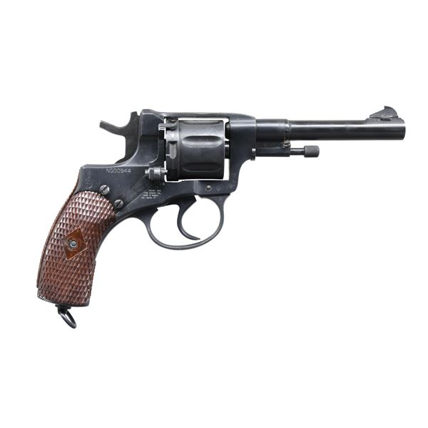 Cal. 7.62 Nagant. S# NG00944. Bbl. 4 1/2". Blade front sight and fixed rear sight. Cyl. has matching numbers on the face; the serial number on the left side has added white highlight paint. Left side of the frame has a Tula star with a 1937 date and a boxed arsenal refurb marking. Right side of the frame has a CDI import marking and importer-added serial number. Arsenal rework blue finish. Checkered brown Bakelite grips. Lanyard ring is present on the bottom of the grip frame. UNATTACHED ACCESSORIES: aftermarket black hard case with pebbled brown holster, cleaning rod, and lanyard. CONDITION: grips show light handling wear. Metal retains 95-97% of its arsenal rework blue finish, with some edge wear, blued-over pitting, and dings. Action functions properly when hand-cycled. Good bore with scattered frosting but strong rifling. (24-6759/MJC). CURIO. $200-300.