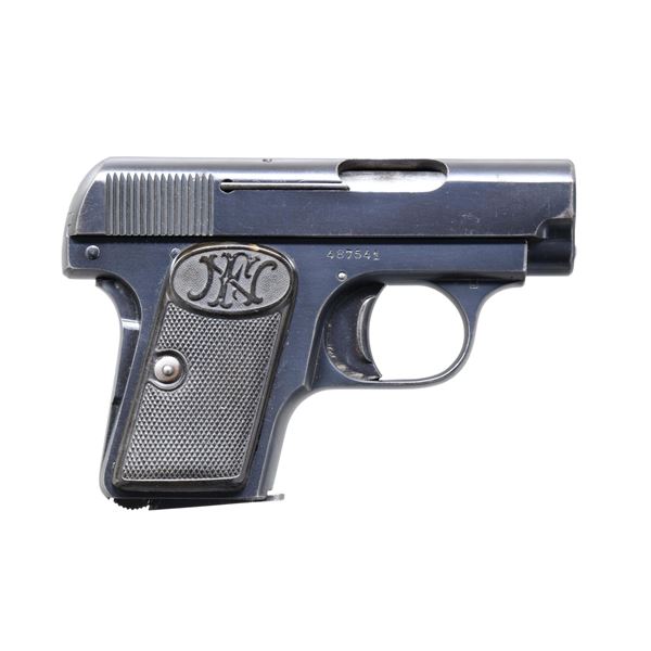 Cal. 6.35mm (25 ACP). S# 487541. Bbl. 2 1/8". Low profile blade front sight. Grooved rear sight. Early FN made Browning 1905 pistol with boxed "V" at front right of trigger guard. Left side of slide has FN roll mark & varied Belgian proofs. Blued finish. Checkered black grips with FN logo. MAGS: 1-6 rd. UNATTACHED ACCESSORIES: aftermarket hardcase with black leather holster. CONDITION: grips show a few handling marks & some light wear. Metal retains 90% original blue with scattered light oxidation & some edge wear. Action functions properly when cycled. Very good bore. (24-6918/MJC). CURIO. $300-500.