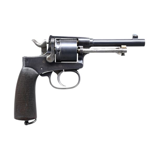 Cal. 8mm Gasser. S# 24165. Bbl. 4 1/2". Blade front sight. Fixed v-notch rear sight. Matching numbers on ejector rod, frame, cyl. & bbl. Left side of frame has Austrian NPV proof, "111.07" marking & KUK crest. No visible date or "WN" markings. Blued finish with strawed trigger & hammer. Checkered hardwood grips. Lanyard ring present on bottom of grip frame. UNATTACHED ACCESSORIES: aftermarket black hardcase with original leather holster. CONDITION: grips show some scratches & handling marks. Trigger & hammer retain strong amounts of straw with scattered light oxidation & trigger turning silver. Balance of metal retains 80% original blue with fading to gray on both grip straps, scattered light oxidation & edge wear. Action functions properly when hand cycled. Bore shows scattered oxidation & dried grease but strong rifling. (24-6780/MJC). CURIO. $400-600.