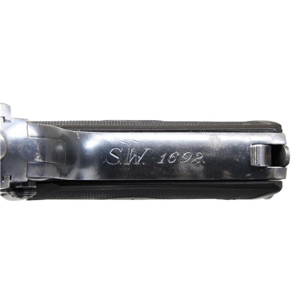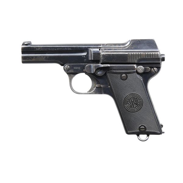 SEMI-AUTOMATIC PISTOL. Cal. 7.65mm. S# 42146. Bbl. 3 1/2". Originally mfg. as a standard Model 1908, this example was subsequently updated to the Model 1908/34 configuration via the addition of a new, sturdier slide. The left side of the bbl. is marked with patent information, followed by a "20." above an Austrian proof, with additional patent information and an Austrian "NPV" proof marked on the right. Rear grip strap is engraved "S.W. 1692," indicating Austrian police issue. Metal components exhibit a period-reapplied blue finish overall. The frame is mounted with 2-piece Steyr checkered black hard rubber grips. Dovetailed blade front sight with integral V-notch rear sight. Matching numbers are present on the frame, slide, and bbl. MAGS: One 7-rd. CONDITION: Good, with metal components retaining the majority of their period-reapplied blue finish, exhibiting areas of wear and thinning that show through to gray patina, as well as scattered spots of light surface oxidation and pitting overall. Bright bore, exhibiting consistent light to mild pitting while retaining well-defined rifling throughout. Grips show some smoothing, as well as some scattered nicks and marks from handling and storage, but otherwise remain sturdy and serviceable. (24-7185/MLW). CURIO. $200-300.