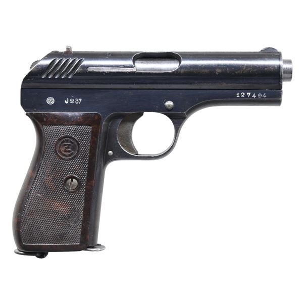 Cal. 380 ACP. S# 127494. Bbl. 3 1/2". Round blade front sight. V-notch rear sight. Matching numbers on the slide and frame. Right side of the frame has the CZ logo and a 1937-dated Czech acceptance stamp. These markings also have added white highlight paint. Top of slide has Czech lion marking & CZ legend. Blued finish with strawed trigger & hammer. Checkered brown grips with CZ logo. MAGS: 1-8 rd. with lanyard ring numbered to a different pistol. CONDITION: grips show scattered handling marks. worn checkering & light dings. Metal retains 75% original blue with scattered fading, light dings, edge wear & some light oxidation. Action functions properly when hand cycled. Very good bore. PROVENANCE: The Estate Collection of Charles Wagner. (25-302/MJC). CURIO. $300-500.