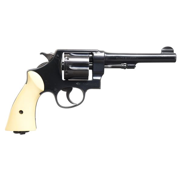 REVOLVER. Cal. 45 ACP. S# 185133. Bbl. 5 1/2" with half moon front sight plus square notched frame at rear. Mfg. approx. 1938 as part of 37,000 unit shipment to Brazil; second contract for 12,000 units in 1946. Sideplate has Brazilian crest and 1937 date; S&W logo on left side of frame plus 'MADE IN USA" on lower right front of frame. Identical features of US Army Model of 1917; 5 screw frame with lanyard swivel. Matching numbers on frame, barrel, cylinder and extractor. Approx. 14,000 imported late 1980's to 1990's; CAI import marked on underside of barrel. Smooth simulated ivory aftermarket grips. CONDITION: very good overall appearance with non factory refinish over light pitting. Good case colors on hammer with checkered spur and serrated trigger. Good bore with distinct rifling having frosted appearance. Lanyard swivel has grey finish. Near excellent grips. PROVENANCE: From the Lifelong Collection of George Staden S&W Member #3451. (25-64/NW). CURIO. $300-450.