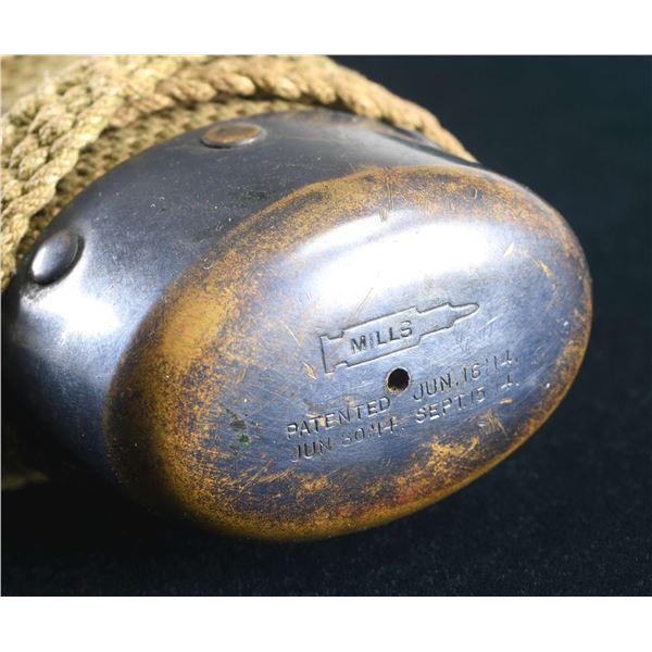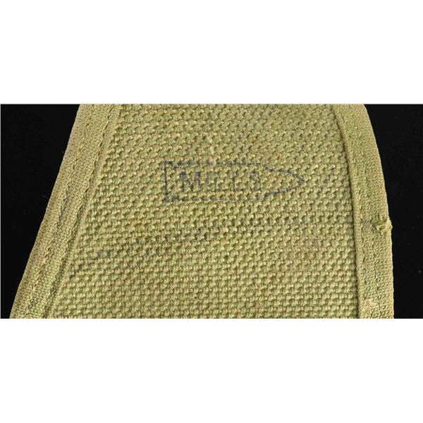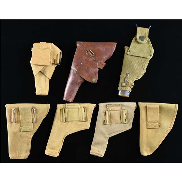 Lot of 7 British & Commonwealth holsters, including: 1) British Webley .455 Caliber holster. Brown leather construction, with brass fittings. Holster is unmarked. CONDITION: leather remains malleable, exhibiting some wear, some scattered handling marks, as well as scattered areas of age related cracking and light crazing. 2) 2 .38 Caliber revolver holsters. Khaki canvas construction, with brass fittings. CONDITION: good, with some light wear and age related discoloration. 3) .38 Caliber revolver holster. Khaki canvas construction, with brass fittings. Holster features 6 bullet loops, and a cleaning rod slot. Cleaning rod is present. CONDITION: good, with some light wear and age related discoloration. 4) Canadian 1st Model Inglis Hi-Power holster. Khaki canvas construction, with steel fittings. Complete with cleaning rod. CONDITION: good, with some light wear and age related discoloration. 5) Canadian 2nd Model Inglis Hi-Power holster. Khaki canvas construction, with steel fittings. Complete with cleaning rod. CONDITION: good, with some light wear and age related discoloration. 6) U.S. Mills Army Model 1911 holster. Green canvas construction, with brass fittings. Interior of closure flap is marked with the Mills bullet logo. Brass tip is marked with the Mills logo above "PATENTED JUN.16,'14/ JUN.30,'14. SEPT.15,'14". CONDITION: good, with some discoloration the the canvas and areas of wear and thinning to the brass fittings. (02-23713/MLW). $400-600.