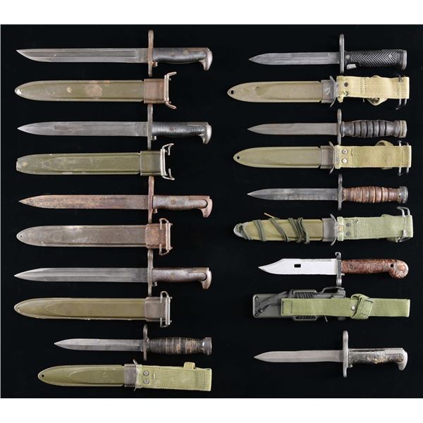 No.1: US M4 Bayonet. 6 3/4" parkerized blade. 11 5/8" overall. Crossguard is marked "US / M4 / CAMILLUS". Grooved leather washer handle. Latch in pommel. Black plastic scabbard marked "USM8A1". Scabbard includes belt hook & green nylon tie-down. CONDITION: bayonet has light wear & handling marks w/ thinning original finish. Scabbard in good serviceable condition. No.2: US M4 Bayonet. 6 5/8" parkerized blade. 11 1/2" overall. Crossguard is marked "US / M4 / CASE". Grooved leather washer handle. Latch in pommel. Scabbard marked "USM8A1". CONDITION: bayonet has seen extensive service causing wear, loss of finish, dents & handling marks. Scabbard remains in good serviceable condition. No.3: Unmarked M4 Bayonet, likely West German. 6 3/4" parkerized blade. 11 5/8" overall. Molded one piece grooved black rubber grip. Latch in pommel. Scabbard is marked "USM8A1". CONDITION: bayonet retains most of its parkerized finish w/ light wear. Rubber handle has seen little use. Moderately worn, but serviceable scabbard. No.4: US M6 Bayonet. 6 3/4" fullered blade. 11 1/2" overall. Crossguard is marked on front "U.S. / M6 / MILPAR CO". Bayonet fits M14 rifle. Black checkered plastic grips. Finger latch behind crossguard. Green plastic scabbard marked "USM8A1". CONDITION: bayonet shows a small amount of careful use w/ light wear & scattered handling marks retaining nearly all original finish. No.5: US Model 1905 E1 Bayonet. 9 7/8" cut-down parkerized fullered blade. 14 1/2" overall. Bayonet made by shortening the original Model 1942 to the M1 configuration. Blade is marked on left ricasso "UC / U / flaming bomb / S / 1942". Marked on right ricasso "UFH". Ribbed black plastic grips. Green plastic scabbard. Metal throat w/ belt hook is marked "US" in "flaming bomb". CONDITION: bayonet shows extensive wear, oxidation & light pitting. Blade has been sharpened. Scabbard is worn. Metal throat has oxidation & fine pitting. No.6: Fighting knife made from US bayonet. 6 1/2" blade. 11 1/4" overall. Blade is lightly fullered & appears to have been re-ground from a longer bayonet. No markings are visible. Crossguards grips & pommel are all standard model 1942 type. No scabbard is present. Knife shows non-arsenal type workmanship & is likely a theater-made item. CONDITION: the metal appears to have been re-parkerized. Grips show heavy wear & staining. No.7: US M1 Bayonet. 9 3/4" parkerized fullered blade. 14 3/8" overall. Blade is marked on left ricasso "UC / U / flaming bomb / S". Black plastic grooved grips. Green plastic scabbard. Entire scabbard has been coated in green paint. CONDITION: bayonet shows considerable loss of finish on the blade w/ wear & staining. Grips have moderate wear. Scabbard is missing part of tip. No.8: US Model 1905 E1 Bayonet. 9 15/16" parkerized fullered blade. 14 1/2" overall. Blade has been shortened from a Model 1942 as the fuller runs through the point. Left ricasso is marked "AFH / U / flaming bomb / S". Grooved plastic grips. Green plastic scabbard. Metal throat is marked w/ "USA" in "flaming bomb". CONDITION: bayonet retains a large degree of its arsenal rework parkerization w/ light wear. Grips have light wear. Scabbard has light overall wear. No.9: US Model 1905 E1 Bayonet. 9 5/8" fullered blade. 14 1/4" overall. Bayonet has extensive weathering oxidation & pitting. Perhaps a battlefield recovery. Blade is marked on left ricasso "AFH / U (flaming bomb) S / 4?". Ribbed plastic grips. Green plastic scabbard w/ illegible markings. CONDITION: bayonet has functional latch & partly legible markings. Bayonet is turned overall patina w/ oxidation & pitting. Scabbard appears serviceable. No.10: AK-47 Bayonet. 5 3/4" bright saw-back blade. 10 3/4" overall. Bayonet marked only w/ S# on crossguard. Brown plastic grips. Scabbard is new-made green plastic replacement w/ sharpening stone, black lacing & nylon belt loop. CONDITION: bayonet has chipped cutting edge. Saw-teeth flattened. Grip is heavily worn w/ dents & scratches. Replacement scabbard in very good condition. (02-23843/RW). NON-GUN. $500-800.