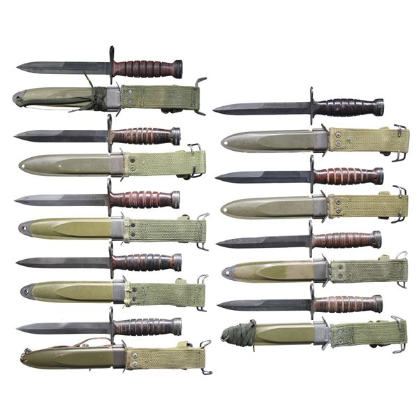 THE M1 CARBINE. The M4 Bayonet was developed for the M1 Carbine & although a few were issued during WWII, it is generally considered a post-war item. These bayonets are all equipped w/ the improved M8A1 scabbard constructed of plastic w/ a metal throat & green web frog. No.1: 6 5/8" blade. 11 1/2" overall. Crossguard marked "US M4 / CAMILLUS". Leather washer handle has six grooves. Scabbard has nylon tie-down strap. No.2: 6 9/16" blade. 11 1/2" overall. Crossguard marked "US M4 / flaming bomb / IMPERIAL". Leather washer handle w/ 6 grooves. No.3: 6 3/4" blade. 11 3/4" overall. Crossguard is marked "U.S. M4 / AERIAL". Leather washer handle w/ 5 grooves. No.4: 6 11/16" blade. 11 5/8" overall. Crossguard is marked "U.S. M4 / CAMILLUS". Leather washer handle w/ 6 grooves. No.5: 6 3/4" blade. 11 11/16" overall. Crossguard is marked "US M4 / PAL". Leather washer handle w/ 6 grooves. No.6: 6 5/8" blade. 11 5/8" overall. Crossguard is marked "US M4 / UTICA". Leather washer handle w/ 6 grooves. Scabbard has rawhide tie-down strap. No.7: 6 11/16" blade. 11 5/8" overall. Crossguard is marked "US M4 / flaming bomb / IMPERIAL". Leather washer handle w/ 6 grooves. No.8: 6 5/8" blade. 11 5/8" overall. Crossguard is marked "US M4 / CASE". Leather washer handle w/ 6 grooves. Replacement nylon tie-down strap. No.9: 6 3/4" blade. 11 5/8" overall. Crossguard is marked "US M4 / KI". Leather washer handle w/ 6 grooves. Grooves have appearance of being recut. CONDITION: all bayonets show evidence of light to moderate wear w/ handling marks. Blades may have a very light sharpening. Scabbards have light wear, staining & scratches. (02-23701/RW). NON-GUN. $400-600.