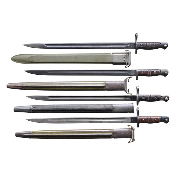 No.1: Winchester bayonet. 17" blued fullered blade. 21 11/16" overall. Blade is marked on left ricasso "1917" & encircled "W". Marked on right ricasso "U.S. / flaming bomb / eagle acceptance mark / X". Straight crossguard. Walnut handle w/ 2 grooves retained by screws. Drain hole is present in pommel. Green plastic scabbard w/ metal throat is marked "US-M1917 / B M CO". Bayonet retains 60% arsenal rework blue finish w/ light wear. Blade has been sharpened before bluing. Grips have moderate wear, staining & small missing chips. Plastic scabbard is in very good condition. No.2: Remington bayonet. 16 1/2" blued fullered blade. 21 5/8" overall. Blade marked on left ricasso "1917" & encircled "REMINGTON". Right ricasso has "flaming bomb / U.S. / eagle head acceptance mark / 29". Walnut grips w/ 2 grooves. Black leather scabbard w/ metal throat & tip. CONDITION: blade has been lightly sharpened before the moderately worn arsenal rework blue finish. Grips have moderate wear, staining & handling marks. Scabbard shows wear & scuffing of the black leather. Throat & tip turning gray & patina. Stitching appears generally tight. No.3: Remington bayonet. 16 15/16" blued steel fullered blade. 21 3/4" overall. Blade is marked on left ricasso "1917" & encircled "REMINGTON". Right ricasso has "flaming bomb / U.S. / eagle head / 5". Grooved walnut grips. Right grip has lightly stamped "5". Pommel w/ drain hole stamped "37". Green leather scabbard marked "E.J.B.". Metal throat & tip. CONDITION: blade retains most of its arsenal rework blue finish w/ light wear. Blade has been lightly sharpened before bluing. Grips have light wear & scattered handling marks. Scabbard has moderate wear & scratches. Metal parts turning gray & patina. No.4: Remington bayonet. 17" fullered two-tone blade. 21 11/16" overall. Blade was bright, now turned gray. Approx. 1" forward of crossguard. Ricasso is blue. Left ricasso marked "1917" & encircled "REMINGTON". Right ricasso marked w/ "flaming bomb / U.S. / X / eagle head / 1". Grooved walnut grips. Pommel has drain hole. Green leather scabbard w/ metal throat & tip. Scabbard is faintly marked on back w/ "GK / J.L.R.". CONDITION: blade has been lightly sharpened. Original finish has light wear, turning gray. Balance of metal retains a large degree of original blue. Grips have good appearance w/ scattered handling marks. Scabbard has worn green finish w/ scratches. Metal parts turning gray & patina. (02-23709-2/RW). NON-GUN. $350-550.