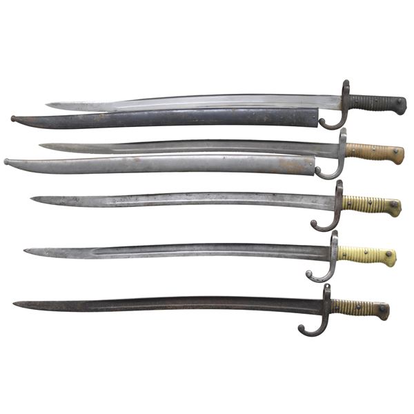 All w/ ribbed brass handles secured by a push-button catch. All crossguards have curved quillons & are equipped w/ the muzzle adjustments. No.1: 22 5/8" fullered curved bright blade. 27 1/2" overall. Markings in script on back of blade include "Chat / 1872". Blade & crossguard are marked w/ tiny acceptance marks. Crossguard has serial number. Steel scabbard. CONDITION: blade has turned overall gray w/ moderate wear. Edge has extensive chipping issues. Handle has turned a pleasing patina w/ moderate wear & small handling marks. Scabbard has been cleaned, but is returning to gray & patina. No.2: 22 5/8" curved bright fullered blade. 27 1/2" overall. Blade markings in script on back include "Ste / Etienne / 1873". Crossguard & ricassos have acceptance marks as well as S#s. Steel scabbard. CONDITION: bright blade has light wear w/ scattered spots of light oxidation & fine pitting most notable in the tip area. Handle & crossguard have a very dark patina appearance w/ light oxidation. Scabbard has turned overall patina w/ light oxidation & light wear. No.3: 22 3/4" bright fullered curved blade. 27 5/8" overall. Blade markings in script on back include "St / Etienne / 1874". Ricassos & crossguard carry acceptance marks as well as S#s. Scabbard is not present. CONDITION: blade has wear, turning gray & patina w/ areas of light oxidation. Handle has turned a worn, but pleasing patina. No.4: 22 1/2" bright fullered curved blade. 27 1/2" overall. Blade markings in script on back include "St / Etienne / 1869". Ricassos & crossguard have acceptance marks as well as S#s. Scabbard is not present. CONDITION: blade is well-worn w/ dents & handling marks turning gray & patina. Handle has been cleaned, but is returning to a warm patina'd appearance. No.5: 22 1/2" curved fullered blade. 27 1/4" overall. Markings on blade & crossguard are illegible due to wear as well as oxidation issues. Scabbard is not present. CONDITION: blade has extensive oxidation & fine pitting throughout. Handle has heavy wear, dents & scratches. Clamping screw is not present on muzzle ring. (02-23851/RW). NON-GUN. $250-400.