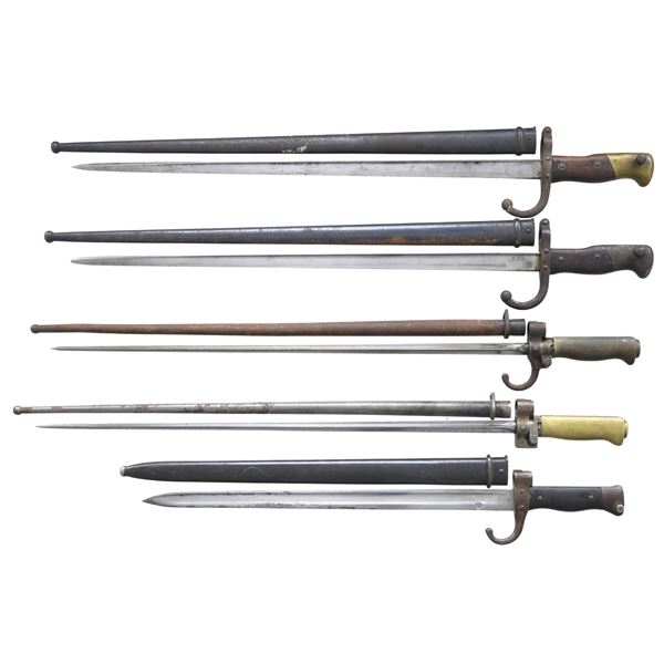 No.1: French Model 1892 Second Pattern Bayonet. 15 5/8" bright fullered blade. 20 1/8" overall. Produced for the Model 1892 Short Rifle which was used by mounted troops, railway & telegraph units. The second model has a muzzle ring which extends backwards over the grip. The top forward end of the blade has an unusual groove. Blade has notches ground to help secure the bayonet inside of its steel scabbard. Blade is marked w/ an encircled "P" on the left ricasso. Crossguard w/ curved quillon carries the serial number. Black composite grips secured by two rivets. Matching steel scabbard. CONDITION: blade has light wear & staining w/ small areas of light oxidation. Balance of metal turning gray & patina. Grips have wear & handling marks. Scabbard shows much of its original blue w/ wear & areas of very light oxidation. No.2: French Model 1874 Gras Bayonet. 20 5/8" bright blade w/ "T" profile. 25 1/2" overall. Blade markings on back in script include "St. / Etienne / 1877". CONDITION: blade is overall gray w/ light wear & light oxidation. Crossguard is turned patina w/ splotches of white paint. Grips have moderate wear & handling marks. Brass pommel has a pleasing patina. Scabbard has traces of blue turning patina w/ light oxidation & scattered spots of white paint. No.3: French Model 1874 Gras Bayonet. 20 3/8" bright blade w/ "T" profile. 26 1/8" overall. Markings in script on top of blade include "St / Etienne / 1876". Crossguard w/ curved quillon carries the S# which matches scabbard. Smooth walnut grips fastened by two rivets. Brass pommel. Matching steel scabbard. CONDITION: blade has moderate wear, light oxidation & spots of very fine pitting. Crossguard has overall patina'd appearance w/ wear. Grips have moderate wear & handling marks. Brass pommel has a very dark worn patina. Scabbard retains a fair portion of his original blue w/ several large areas of light oxidation. No.4: French Model 1886/93/16 Lebel Bayonet. 20 3/8" quadrangular spike blade. 25" overall. Brass handle. Bayonet has only acceptance marks & S#. CONDITION: blade is turning gray & patina as well as crossguard. Handle has pleasing mustard patina w/ light wear. Scabbard has turned overall gray & patina w/ scattered areas of moderate pitting. No.5: French Model 1886 Lebel Bayonet. 20 3/8" quadrangular spiked blade. 25 1/8" overall. Bayonet marked only w/ S# that matches scabbard. Curved quillon. Brass handle. Matching steel scabbard. CONDITION: blade has moderate wear & staining. Crossguard is turning overall patina. Brass handle has a very dark patina appearance. Scabbard has small dents & has turned overall patina w/ extensive light oxidation. (02-23853/RW). NON-GUN. $300-500.