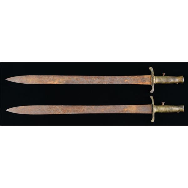 1) Overall length: 26 5/8". Blade length: 21 3/4". Plain blade with a narrow fuller that extends 8 1/2" up the blade. Blade is marked near the hilt "(crown)" over "VR ENFIELD 1840" and "(crown)" over "V" over "6". Brass hilt with a simple crossguard having dual downturned quillions. The crossguard is stamped "F11" & "RCR" for Royal Canadian Regiment. Brass horizontally reeded grip with iron spring and button. No scabbard. CONDITION: blade is universally rusted and hilt shows a pleasing dark patina. 2) Overall length: 26 1/4". Blade length: 21 1/2". Plain blade with a narrow fuller that extends 8 1/2" up the blade. Blade is marked near the hilt "(crown)" over "VR ENFIELD 1839" and marks on the other side are obscured by oxidation. Brass hilt with a simple crossguard having dual downturned quillions. Brass horizontally reeded grip with iron spring and button. The pommel is engraved "5 Co. 86". No scabbard. CONDITION: blade is heavily rusted; however, the hilt shows a pleasing dark patina. (02-23837/BF) $500-800.