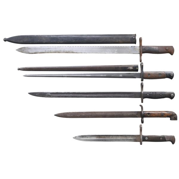 No.1: Swiss Model 1911 Pioneer Bayonet. 18 7/8" bright saw-back blade w/ fuller on the right side only. 24" overall. Marked on right ricasso "ELSENER SCHWYZ". Straight steel crossguard w/ muzzle ring. Smooth walnut grips retained by two rivets. This bayonet fits the model 1911 Schmidt-Rubin carbine. Steel scabbard w/ ball tip. CONDITION: bayonet blade has been sharpened w/ light wear & staining. Saw-back appears to be reasonably sharp. Balance of metal has turned a dark patina w/ oxidation & very fine pitting throughout. Grips have light wear & scattered handling marks. Scabbard is turning gray & patina. No.2: Belgian Model 1916 Cruciform Bayonet. 17 3/4" blued blade. 22 1/2" overall. Bayonet for the Model 1889 Mauser rifle is marked only w/ S# on crossguard. Crossguard has muzzle ring. Smooth walnut grips secured by two rivets. Matching blued steel scabbard w/ ball tip. CONDITION: bayonet has thinning finish w/ light wear. Grips have light wear & scattered handling marks throughout. Scabbard has dents & scratches w/ handling marks throughout. No.3: Swedish M19 Bayonet. 12 3/4" blade w/ false edge. 17 7/8" overall. Blade is marked on right ricasso "crown over anchor / EJ / AB". Smooth hardwood grips retained by two screws. Front screw is not present. CONDITION: blade is heavily oxidized w/ wear & pitting throughout. Notable chipping on the forward end of the false edge. Balance of metal has turned overall patina. Grips have wear, cracking & staining. No.4: US Remington Model 1917 Bayonet. 16 7/8" fullered blade. 21 5/8" overall. Blade is marked on left ricasso "1917" & encircled "REMINGTON". Marked on right ricasso "flaming bomb / U.S. / eagle head / 25 / acceptance mark". CONDITION: metal parts show traces of original blue w/ wear, light oxidation & fine pitting turning overall patina. Sharpened edge has tiny chips missing at forward end. Grips have wear, staining & chipping. No.5: Austrian Model 1895 Mannlicher Bayonet. 9 3/4" bright blade. 14 5/8" overall. Bayonet has distinctive profiled grip. Bayonet is marked only w/ S# on crossguard. Smooth walnut grips secured by two rivets. CONDITION: metal parts are turning gray & patina w/ extensive light oxidation & fine pitting. Blade has been sharpened. Grips have moderate wear & handling marks. (02-23850/RW). NON-GUN. $250-400.