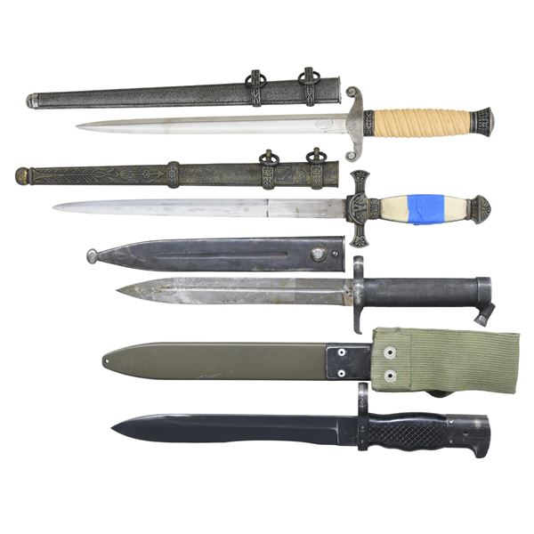 This lot includes 1 Mauser FR8 bayonet and scabbard, measuring 14" overall, with an OD cotton canvas belt loop. / 1 Swedish Model 1896 bayonet and scabbard, measuring 13 3/4" overall. / 1 reproduction WWII German Army dagger, measuring 15 1/2" overall, with its scabbard. / 1 reproduction Napoleonic dagger, measuring 16 1/4" overall, with its scabbard. CONDITION: All items generally show light wear with no notable damage. (02-23658/BF). $150-250.