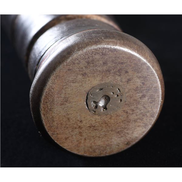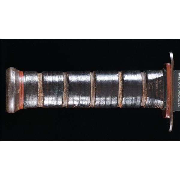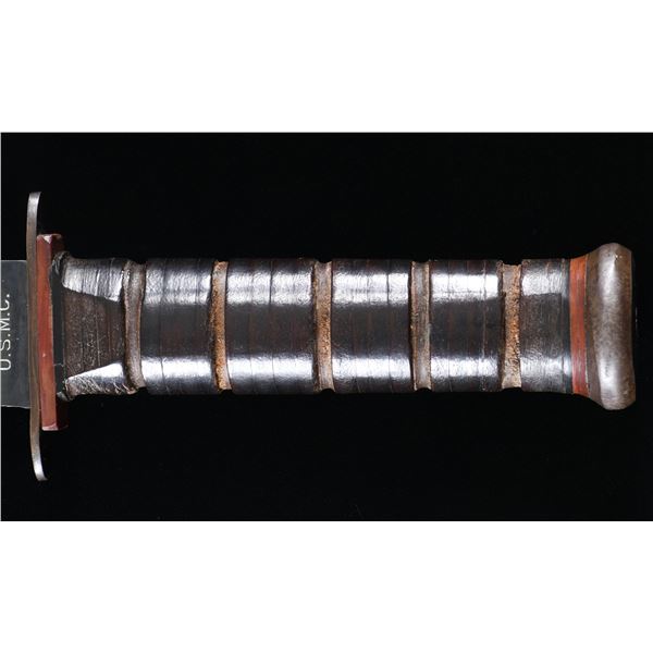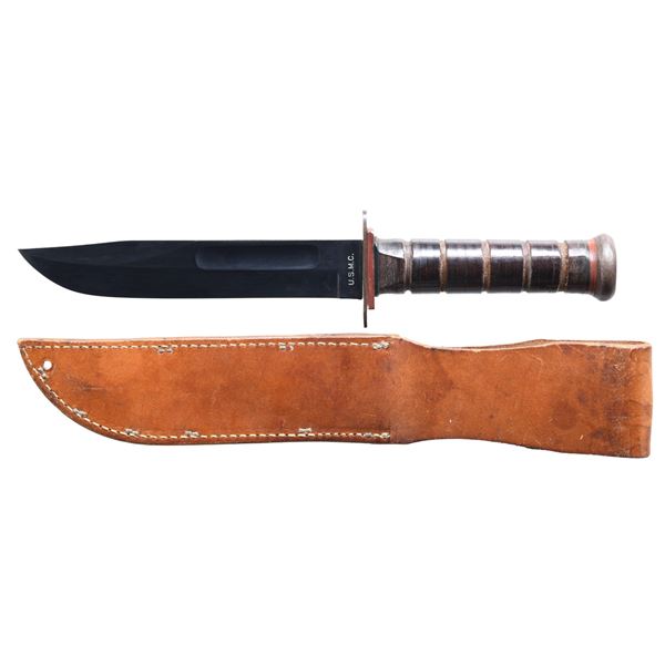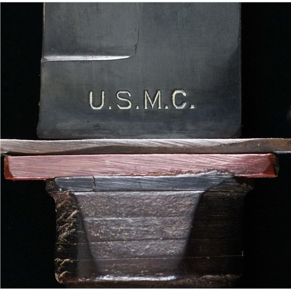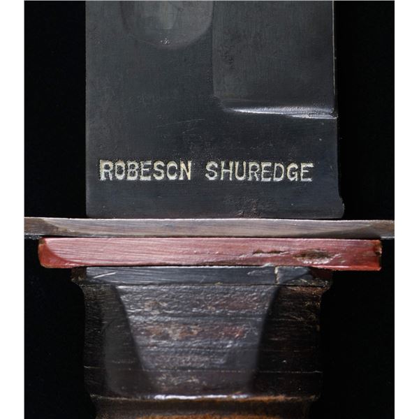FIGHTING KNIFE. 7" blued fullered blade. 12 1/8" overall. These knives are identical w/ the USN Mk2 Fighting Knife except for the USMC. Marked on left ricasso "ROBESON SHUREDGE". Marked on right ricasso "U.S.M.C.". Markings are enhanced in white. Straight steel crossguard. Leather washer handle has 5 grooves. Handle has red & black spacers at each end. Flat disc steel pommel. Unmarked tan leather sheath w/ stitched & riveted construction. UNATTACHED ACCESSORIES: black padded zipper case. CONDITION: knife appears unissued, retaining nearly all of its blued finish on the blade. The crossguard & pommel have turned gray & patina. The handle has several scattered small handling marks. The sheath has light wear & staining, but stitching remains tight & sheath is in good serviceable condition. (02-23690/RW). NON-GUN. $300-500.