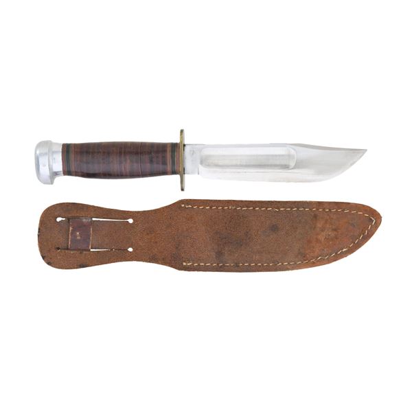 KNIFE. 9 1/4" overall. 5" fullered bright blade. Marked on left ricasso "CAMILLUS CUT. CO. CAMILLUS, N.Y.". Brass crossguard. Leather washer grip. Bright finished aluminum butt. Threaded tang. Unmarked riveted & stitched dark brown leather sheath. UNATTACHED ACCESSORIES: padded zipper carrying case. CONDITION: knife in very good overall condition w/ minor handling marks. Crossguard turning a pleasing patina. Sheath has light wear & staining, but stitching is tight. (02-23691/RW). NON-GUN. $300-400.