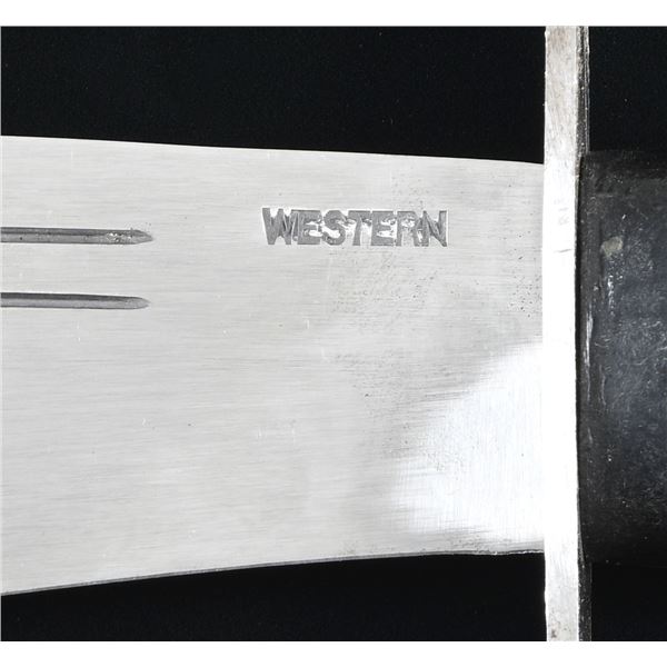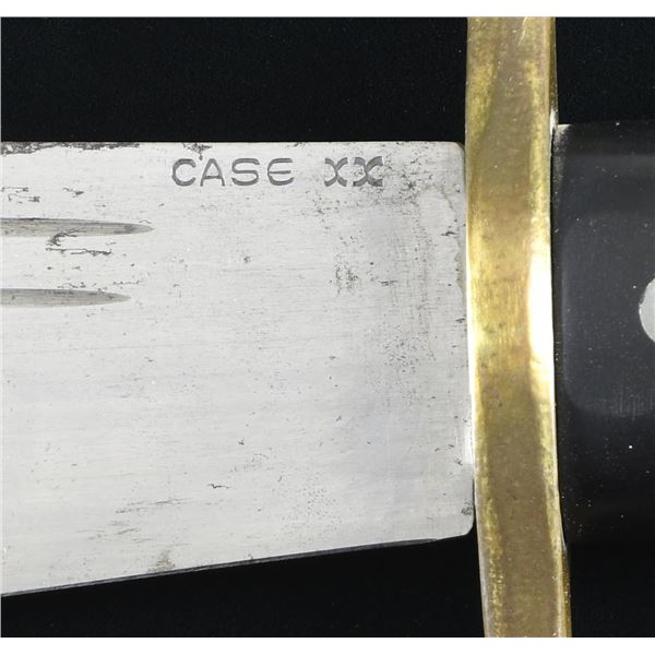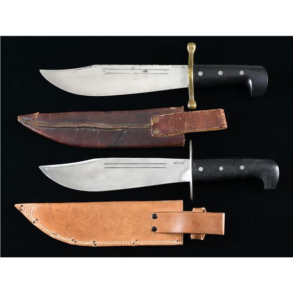 These knives were developed for flying personnel & were also used by the 2nd US Marine Raider Battalion. These knives were made under contract by Case, Western, Kinfolks & Collins. The Western made knives are the most scarce. 1: Western V44 has a 9 1/4 Bowie style blade w/ 2 longitudinal grooves. 14 1/2" overall. Blade is marked on the left side "WESTERN". Straight steel crossguard. 2 piece Bakelite grips retained by 3 steel rivets. Correct tan leather sheathe made w/ the large type rivets, leather belt loop & snap type retaining strap. CONDITION: knife has a very good appearance w/ only light handling wear. Metal parts retain their original bright finish. Sheathe has minor flexing at tip, light wear & scattered spots of staining. Stitching & rivets are tight. 2: Case V44. 9 3/8" blade. 14 1/4" overall. Bright blade w/ 2 longitudinal grooves on each side. Blade is marked on left side "CASE XX". Brass crossguard w/ ball finials. 1 piece Bakelite handle retained w/ 3 poured lead rivets. Correct unmarked brown leather sheathe. Belt loop made w/o retaining strap. Scabbard is made in 1 piece & stitched on reverse side. CONDITION: blade retains most of its bright finish w/ scattered small spots of oxidation throughout. Crossguard has turned a mild patina. Handle shows light wear & tiny handling marks. Sheathe has moderate wear, flexing & staining w/ notable flexing at tip. UNATTACHED ACCESSORIES: padded black nylon case. (02-23679/RW). NON-GUN. $600-900.