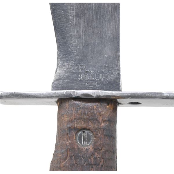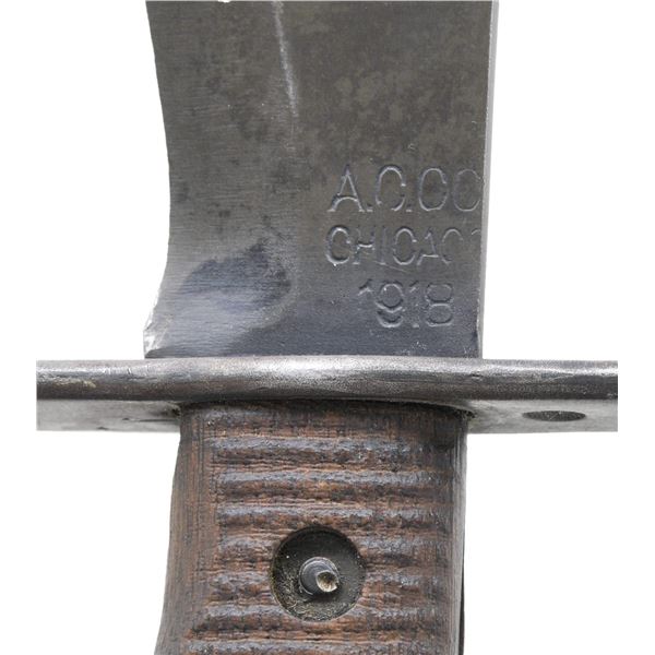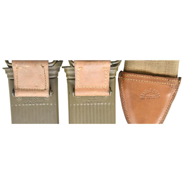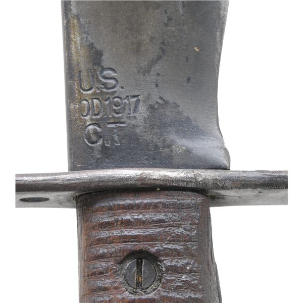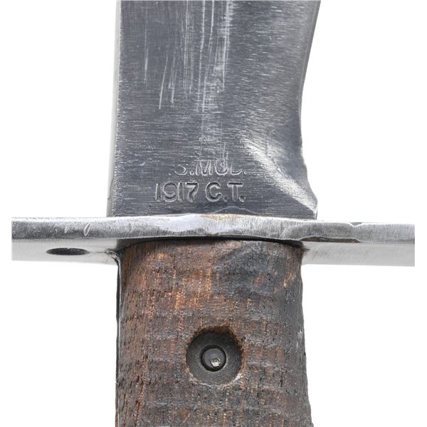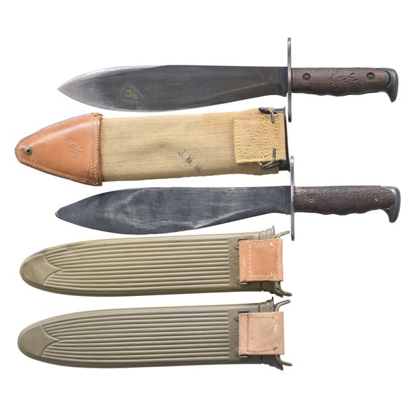 These Bolos are the same knife as a Model 1910, w/ the exception that the scabbard catch was not provided & the Model 1917 CT pommel is integral w/ the tang. 1): 10" blade Bolo. 14 7/8" overall. Left ricasso is marked "A.C.CO / CHICAGO / 1918". Right ricasso marked "U.S. / OD. / 1917 / C.T". Straight crossguard w/ lanyard hole. Pommel is integral w/ the tang as stated & carries rough turned walnut grips retained by 2 screws. Canvas scabbard marked faintly on the back w/ "J.M.M". Tan leather tip is marked "BRAUER BROS. 1918". Brass throat. Model 1910 belt hook. CONDITION: Bolo is very good overall condition. Blade shows a large degree of its original blue finish w/ moderate wear. Edge & false edge have been sharpened. Grips have light wear & staining along w/ notable small dents on left grip. Scabbard has light wear & staining. Stitching remains tight. Brass throat & liner are loose. 2): 10 1/8" blade Bolo. 14 3/4" overall. Left ricasso is marked "PLUMB / ST. LOUIS / 1918". Right ricasso is marked "S.MOD. / 1917 / C.T.". Straight steel crossguard w/ lanyard hole. Coarse turned walnut grips retained by 2 screws. Grips are somewhat proud & may be period replacements. Integral pommel. Green colored metal scabbard is marked "U.S. / L.F. & C." indicating mfg. by Landers, Frary & Clark. Dated 1918. Hinged leather frog. Model 1910 belt hook. CONDITION: blued steel blade has light wear & scratches. Grips have light wear & staining. Scabbard is in very good condition w/ a few tiny spots of missing finish. Stitching is tight. 3): Unissued Type 2 Scabbard. Green painted sheet metal scabbard w/ 1910 belt hook. Marked on back "U.S./L.F.&C.-1918". CONDITION: scabbard shows little wear retaining nearly all of its original finish. There remnants of the original paper wrapper. (02-23678/RW). NON-GUN. $300-500.
