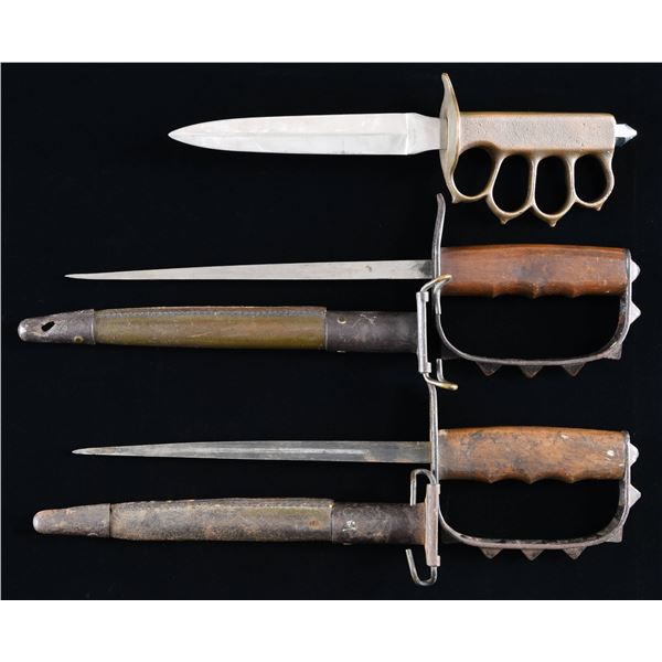 No.1: Model 1917-18 Trench Knife. 8 7/8" triangular blade. 13 7/8" overall. Knuckle bow is marked on front w/ "U.S. / L.F.&C. / 1917". Knife is made w/ knuckle bow & has seven pyramidal knobs. Smooth one piece walnut grip w/ finger grooves. Green leather scabbard w/ metal throat & tip. Scabbard marked faintly "JEWELL-1918". CONDITION: blade has light wear & scattered spots of oxidation, retaining nearly half its original blue. Balance of metal has wear, scattered oxidation & light pitting. Grip has light wear & staining. Well-worn scabbard w/ loose rivets. No.2: Model 1917-18 Trench Knife. 9" triangular blade. 14" overall. Marked on front of crossguard "U.S. / L.F.&C. / 1917". Knuckle bow has seven pyramidal knobs. Smooth walnut grip w/ finger grooves. Green leather scabbard w/ metal throat & tip. Scabbard marked "JEWELL-1918". Metal tip is pierced by what appears to be a shell fragment. CONDITION: blade has been polished bright, but is turning gray. Balance of metal has worn blackened appearance w/ light oxidation. Grip has moderate wear, dents & handling marks w/ notable chip on right side. Scabbard is worn w/ loose tip in throat. No.3: Reproduction Mark One U.S. Trench Knife. 6 3/4" double-edged bright blade. 11 1/2" overall. Cast brass handle w/ knuckle bows. Handle is marked on right side w/ "U.S. / 1918". Pommel has pointed retaining nut which appears to be plated bright. CONDITION: unmarked blade shows a high polish. Edges have been sharpened. Brass handle has a pleasing patina. Scabbard is not present. (02-23845/RW). NON-GUN. $900-1,200.
