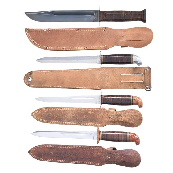 KNIVES. No.1: G46 Fighting Knife. 8" bright fullered blade. 13" overall. Left ricasso has Western logo. Straight steel crossguard. Full tang knife w/ leather washer grips. Red & black spacers. Steel disc pommel. Unmarked stitched & riveted brown leather sheath. UNATTACHED ACCESSORIES: black nylon padded carry case. CONDITION: blade has thinning w/ very light wear & scattered scratches. Leather grips have wear & scuffing. Sheath has light wear, scuffing & staining. Stitching remains tight. No.2: Commando L76 Knife. 6 7/8" bright double-edged blade. 11 1/8" overall. Blade marked on left ricasso "WESTERN / BOULDER, COLO / PAT. #". Straight steel crossguard. Full tang knife has leather washer grips w/ black, red & white spacers. Aluminum pommel. Unmarked tan leather sheath w/ provision for belt loop & has M1910 belt hook. Large lanyard hole at tip. Riveted & stitched construction. CONDITION: bright blade has light wear & scattered small scratches. Leather washer grips have light wear & handling marks & show oxidation w/ grips meet the tang. Scabbard has light wear & staining. Notable area of staining at tip. No.3: Commando L77 Knife. 7" bright fullered single-edge blade w/ false edge. 11 1/4" overall. Left ricasso is marked "WESTERN / BOULDER, COLO / PAT. #". Bakelite guard & pommel. Full tang w/ leather washer grips. Red, black & white spacers. Tan leather sheath w/ stitched & riveted construction. Inked name & address on back. CONDITION: right blade has scattered small scratches. Grips have light wear & handling marks. Sheath has moderate wear & staining. Stitching remains tight. No.4: Commando L77 Knife. 6 7/8" fullered single-edge blade w/ false edge. 11 1/4" overall. Bright blade is marked on left ricasso "WESTERN / BOULDER, COLO / PAT. #". Steel crossguard. Full tang w/ leather washer grips. Red, white & black spacers. Bakelite pommel. Tan leather sheath w/ stitched & riveted construction. CONDITION: blade has very light wear & scattered scratches. Leather washers have light wear & scuffing. Sheath has moderate wear & staining w/ notable abrasion. (02-23676/RW). NON-GUN. $800-1,200.