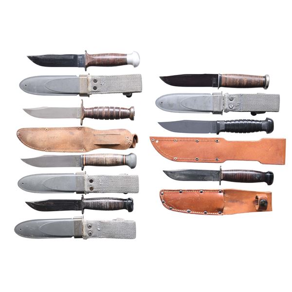 No.1: CAMILLUS Knife. 5" parkerized blade. 9 3/4" overall. Left ricasso marked "U.S.N.". Right ricasso marked "CAMILLUS / N.Y.". Straight steel crossguard. Leather washer handle. Bakelite pommel w/ screw attachment. Unmarked tan leather sheath w/ stitched & riveted construction. CONDITION: blade has moderately worn original parkerized finish. Blade has been lightly sharpened. Leather washer handle has light wear & staining. Sheath has light wear, staining & handling marks. Stitching is tight. No.2: Colonial Knife. 5 1/4" parkerized blade. 10 1/16" overall. Blade marked on left ricasso "COLONIAL / PROV / R.I.". Right ricasso marked "U.S.N.". Grooved 1 piece black molded rubber handle. Tan leather sheath w/ stitched & riveted construction. Marked on front "USN". CONDITION: knife & sheath appear unissued & have only very tiny scattered handling marks. No.3: IMPERIAL Knife. 5 1/8" parkerized. 9 7/8" overall. Marked on left ricasso "Imperial / USA". Straight steel crossguard. Grooved leather washer handle. Steel disc pommel. Brown leather sheath marked only w/ faint "bored sailor" initials on front. Stitched & riveted construction. CONDITION: blade retains a large degree of original parkerized finish. Handle has moderate wear & scuffing. Sheath has light wear & staining, stitching remains tight. No.4: PAL Knife. 5 1/4" parkerized blade. 10 1/4" overall. Left ricasso marked "U.S.N. / MARK 1". Right ricasso marked w/ PAL logo & "RH35". Steel crossguard. Leather washer handle w/ red, white & black spacers. Aluminum pommel. Gray plastic scabbard marked on front "U.S.N. / MK1". CONDITION: blade has lightly worn original parkerized finish. Handle has light wear & scuffing w/ small scratches throughout. Scabbard has wear & light oxidation. No.5: Robeson Shuredge Knife. 5 1/8" blued steel blade. 9 7/8" overall. Blade is marked on left ricasso "U.S.N. / M.K.1.". Right ricasso marked "ROBESON / SHUREDGE / NO.20". Steel crossguard. Leather washer handle. Aluminum pommel. Gray plastic scabbard. Scabbard marked on front "U.S.N. / MK1". CONDITION: blade retains 60% original finish w/ scattered spots of very light oxidation. Handle has light wear & handling marks. Scabbard has light wear & staining. No.6: CAMILLUS Knife. 5" blued blade. 9 5/8" overall. Left ricasso marked "U.S.N. / MARK 1". Right ricasso marked "CAMILLUS / N.Y.". Straight steel crossguard. Leather washer handle. Black plastic pommel. Gray plastic scabbard marked "U.S.N. / MK 1". CONDITION: blade has 50% original worn finish w/ areas of very light oxidation. Blade has been sharpened. Leather handle has wear, scuffing & scratches. Scabbard has light wear & scuffing. No.7: KA-BAR Knife. 5 1/8" blued blade. 9 1/2" overall. Blade is marked on left ricasso "KA-BAR / OLEAN, N.Y.". Marked on right ricasso "USN". Straight steel crossguard. Leather washer handle. Steel disc pommel. Gray plastic scabbard marked "USN / MK 1". CONDITION: blued steel blade has light wear & scattered spots of oxidation. Leather handle has wear, scuffing & staining. Scabbard has light wear & staining. (02-23705/RW). NON-GUN. $600-900.