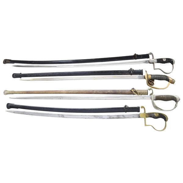 1) Overall length: 37 1/4". Blade length: 32". Plain blade with a single medium fuller. Gilded brass reverse-P hilt with plain languets. Wire wrapped leather grips. Unassociated black enameled scabbard. CONDITION: blade has a medium gray patina with some staining. Gilt shows light over wear with a pleasing tarnish and some light verdigris. The scabbard retains 95% of its original finish but the scabbard is too short for the sword. 2) Overall length: 39 1/2". Blade length: 32 3/4". Plain blade with a single, nearly central, fuller. Plated semi-basket hilt with 3 branches and a monogram at the top of the backstrap. Horn grip with no evidence of wire wrap. Plated iron scabbard. CONDITION: blade shows traces of original factory polish but does show evidence of sharpening. Hilt shows light wear but the outer most branch is a bit bent. Grip is undamaged. Scabbard shows significant oxidation and some loss of finish, but it is solid. 3) Overall length: 37". Blade length: 29 1/2". Plain blade with a double narrow fuller. Gilded brass hilt with a folding front guard featuring a pierced Prussian eagle. Canted pommel with a wire wrapped composite grip, showing a royal cypher on the front. Black enameled iron scabbard. CONDITION: blade shows some original factory polish. Hilt shows light overall wear. Scabbard finish is better than 90%. 4) Overall length: 39 1/2". Blade length: 33 1/2". Plain blade with a single medium fuller marked at the ricasso "ANTON WINGEN JR (logo) SOLINGEN". Plain plated reverse-P hilt with wire wrapped composite grip. Black enameled iron scabbard. CONDITION: blade shows brilliant original factory polish. Hilt shows very light wear. Grip is complete but wire has a few breaks and has become dislodged. Scabbard show two minor dents and retains better than 90% of its original finish. (02-23827/BF). $700-900.