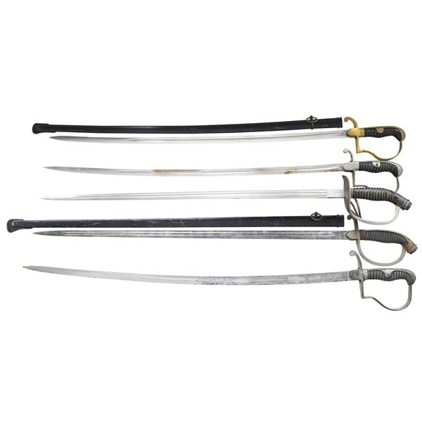 1) Overall length: 39". Blade length: 33 3/4". Blade has a single medium fuller and is etched over the first 15". One side depicts a mounted regiment at the charge with various geometric motifs. The other side shows a mounted officer, foliate motifs, and a 7" panel that appears to read "Kurhess. Train Bataillon No 11.". Plain iron reverse-P hilt with a shark skin grip. No scabbard. CONDITION: blade has a light gray finish with some oxidation, particularly near the ricasso. The iron hilt has been painted silver. Grip is 99% but lacks wire wrap. 2) Overall length: 37 1/2". Blade length: 32 1/4". Plain blade with a single medium fuller, marked at the ricasso "(Knight's head) WKC". Gilded brass hilt with oak leaf adorned languet, backstrap, knuckle bow, and pommel. Wire wrapped black composite grip. Black enamel iron scabbard. CONDITION: blade shows original factory polish with a mirror finish. Hilt and grip show very light wear. Scabbard finish is better than 95%. 3) Overall length: 36 7/8". Blade length: 32". Plain blade with a single medium fuller, marked at the ricasso "(Knight's head) WKC". Plain reverse-P plated hilt. Wire wrapped black composite grip. No scabbard. CONDITION: blade has areas of original factory polish with some oxidation. Hilt generally shows light wear but also has spots of oxidation. Grip is complete. 4) Overall length: 37 1/4". Blade length: 31". Blade has a double narrow fuller and is etched on a 7" panel on both sides with foliate motifs and the words "In Treue Fest" denoting a Bavarian officer's sword. Plated iron hilt with 3-branch guard and canted pommel. Wire wrapped black composite grip. No scabbard. CONDITION: blade has areas of original factory polish with some staining near the ricasso. Hilt is quite solid but does show wear. Grip is 100% with a few wires dislodged. 5) Overall length: 40 1/2". Blade length: 33". Blade has a double narrow fuller and is etched on 4 1/2" panel on both sides with foliate motifs and the words "In Treue Fest" indicating use by a Bavarian officer. Plated hilt with spade languets and a canted pommel. Wire wrapped shark skin grip. Black enameled iron scabbard. CONDITION: blade has an overall gray patina and etching is a bit light. Hilt shows moderate wear. Scabbard finish is about 70%. (02-23826/BF) $700-1,000.